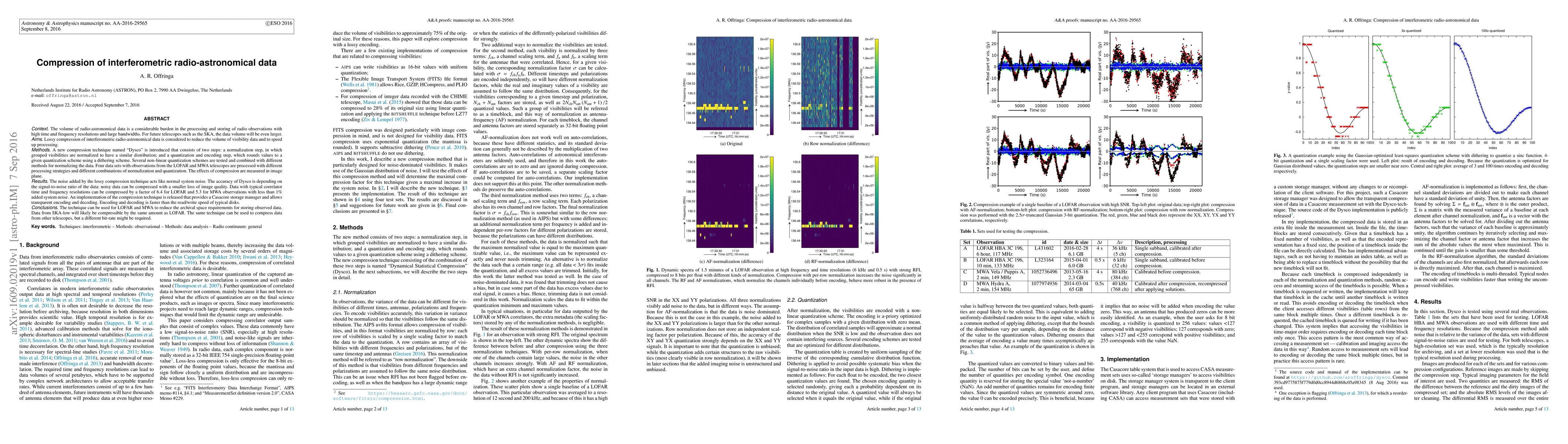 The paper introduces a new lossy compression technique called "Dysco" to reduce the volume of interferometric radio-astronomical data, enabling faster processing. The technique normalizes and quantizes data, achieving compression factors of 6.4 and 5.3 for LOFAR and MWA observations, respectively, with minimal added noise.