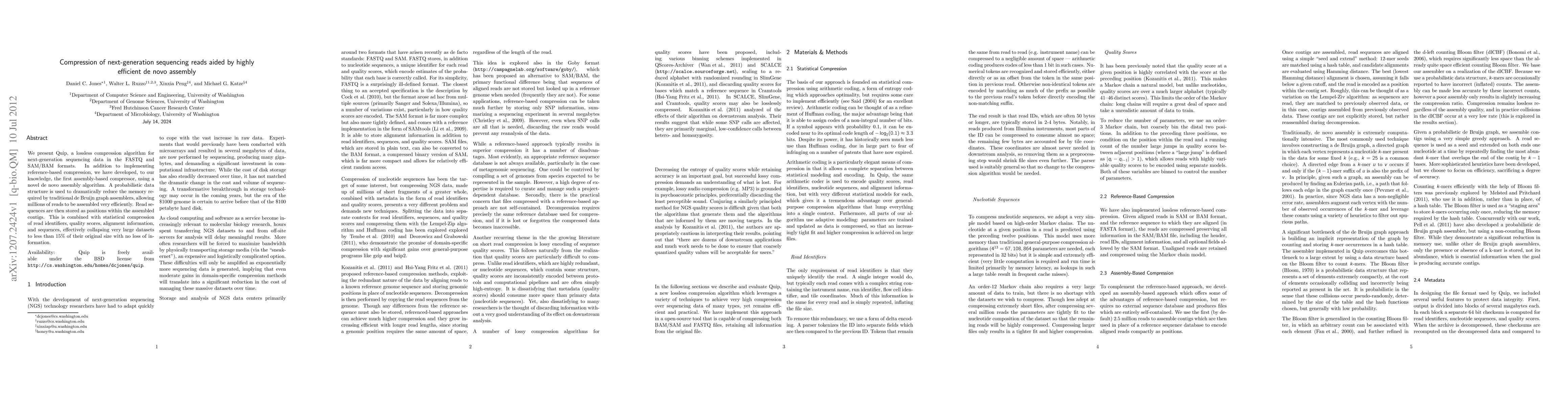 Quip is a lossless compression algorithm for next-generation sequencing data, utilizing both reference-based and novel assembly-based compression techniques to reduce memory usage and efficiently collapse large datasets to less than 15% of their original size. It is freely available under the BSD license.