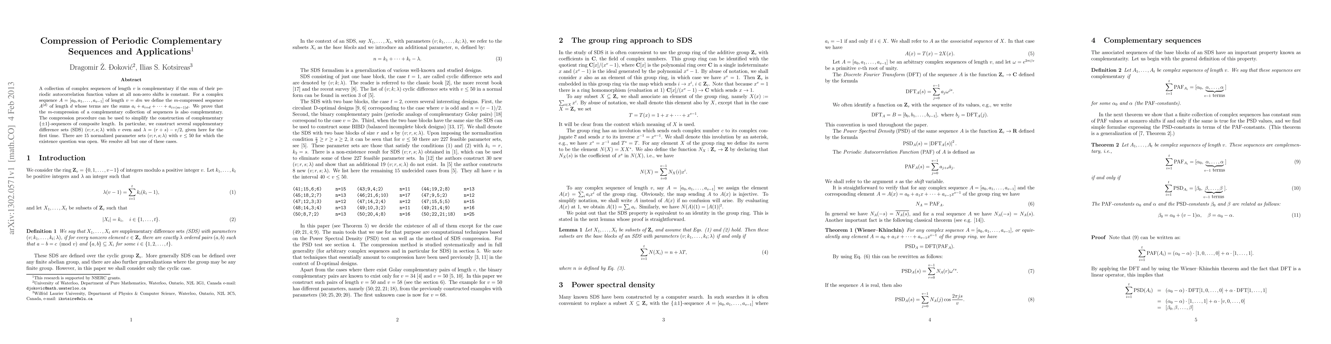 A collection of complex sequences of length v is complementary if the sum of their periodic autocorrelation function values at all non-zero shifts is constant. For a complex sequence A=[a_0,a_1,...,a_{v-1}] of length v=dm we define the m-compressed sequence A^{(d)} of length d whose terms are the sums a_i + a_{i+d} + ... + a_{i+(m-1)d}. We prove that the m-compression of a complementary collection of sequences is also complementary. The compression procedure can be used to simplify the construction of complementary {+1,-1}-sequences of composite length. In particular, we construct several supplementary difference sets (v;r,s;lambda) with v even and lambda=(r+s)-v/2, given here for the first time. There are 15 normalized parameter sets (v;r,s;lambda) with v <= 50 for which the existence question was open. We resolve all but one of these cases.
