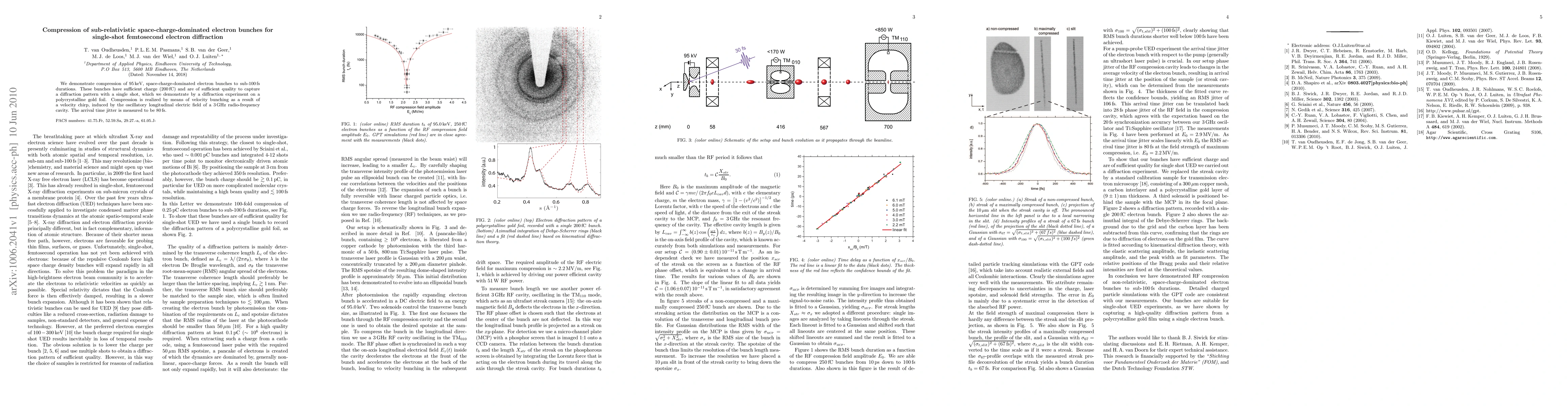 We demonstrate compression of 95 keV, space-charge-dominated electron bunches to sub-100 fs durations. These bunches have sufficient charge (200 fC) and are of sufficient quality to capture a diffraction pattern with a single shot, which we demonstrate by a diffraction experiment on a polycrystalline gold foil. Compression is realized by means of velocity bunching as a result of a velocity chirp, induced by the oscillatory longitudinal electric field of a 3 GHz radio-frequency cavity. The arrival time jitter is measured to be 80 fs.