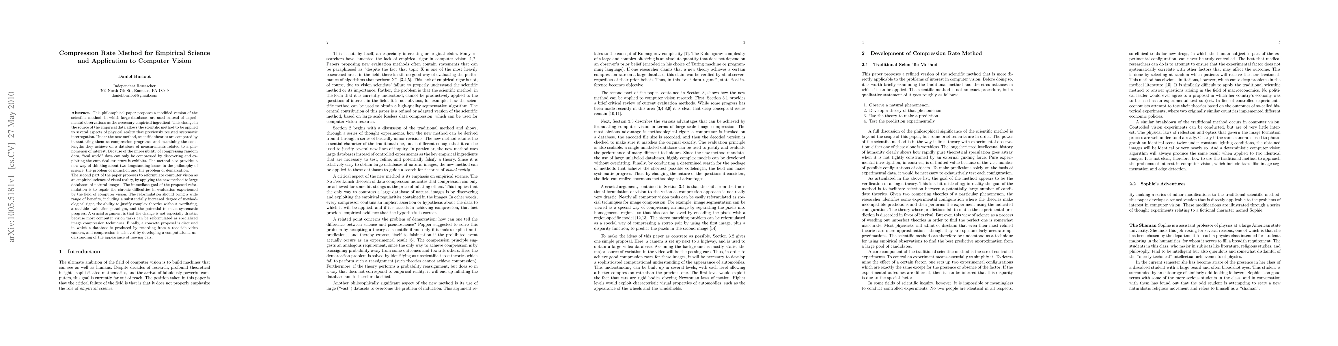 This paper proposes a modified scientific method using large databases instead of experiments, comparing theories via compression program codelengths to exploit empirical structures. It applies this method to reformulate computer vision as an empirical science, aiming to resolve evaluation issues and enhance methodological rigor through scalable, non-overfitting theory justification and systematic progress.