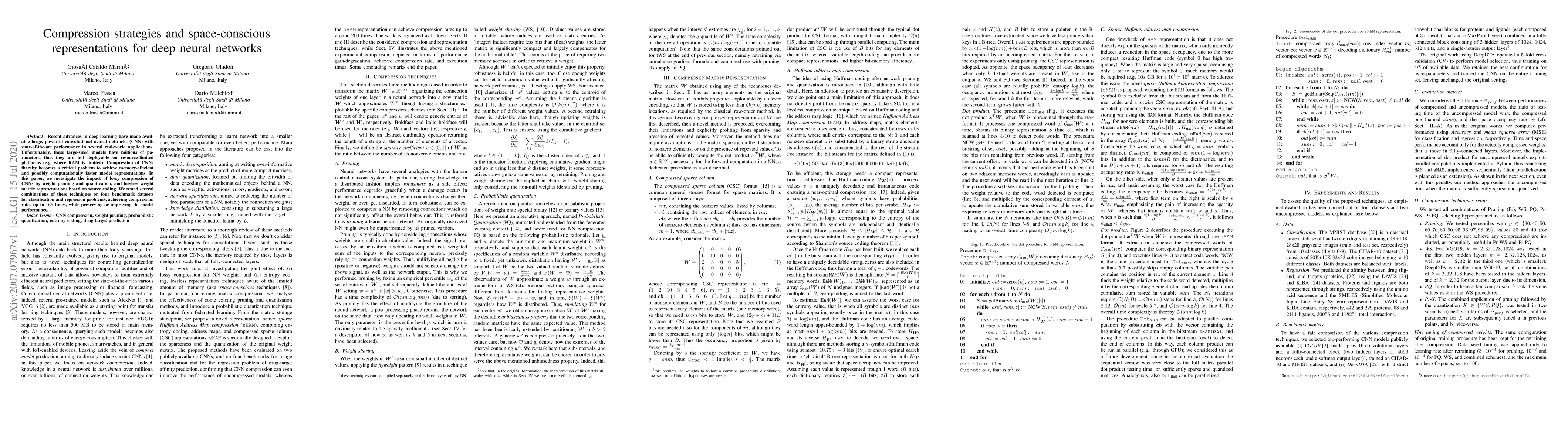 Recent advances in deep learning have made available large, powerful convolutional neural networks (CNN) with state-of-the-art performance in several real-world applications. Unfortunately, these large-sized models have millions of parameters, thus they are not deployable on resource-limited platforms (e.g. where RAM is limited). Compression of CNNs thereby becomes a critical problem to achieve memory-efficient and possibly computationally faster model representations. In this paper, we investigate the impact of lossy compression of CNNs by weight pruning and quantization, and lossless weight matrix representations based on source coding. We tested several combinations of these techniques on four benchmark datasets for classification and regression problems, achieving compression rates up to $165$ times, while preserving or improving the model performance.