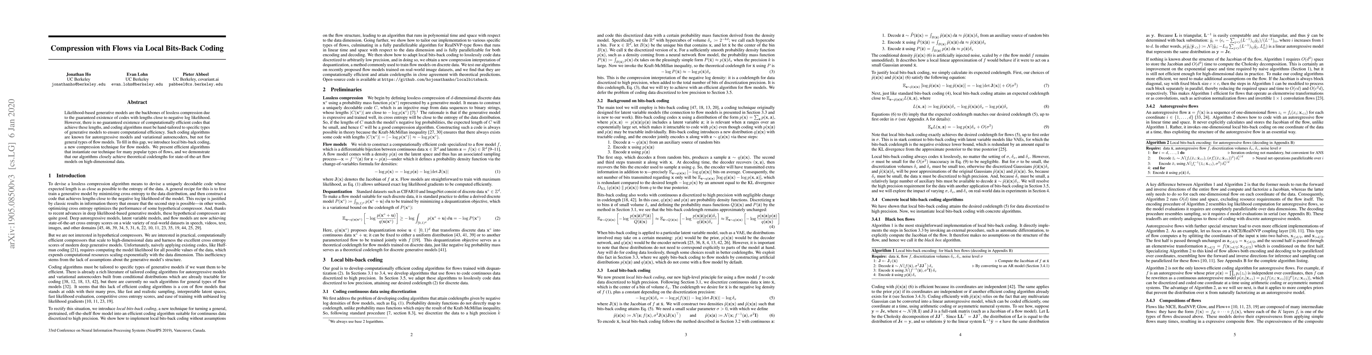 This paper introduces local bits-back coding, a novel compression technique for flow models, addressing the lack of efficient coding algorithms for these models. The authors present efficient algorithms that achieve near-optimal codelengths for state-of-the-art flow models on high-dimensional data.