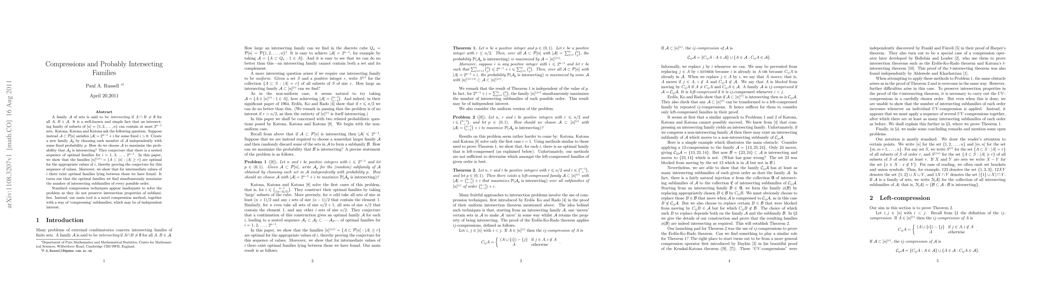 A family X of sets is said to be intersecting if any two members of X have non-empty intersection. It is a well-known and simple fact that an intersecting family of subsets of [n]={1,2,...,n} can contain at most 2^(n-1) sets. Katona, Katona and Katona ask the following question. Suppose instead a family X of subsets of [n] satisfies |X|=2^(n-1)+i for some fixed i>0. Create a new family X_p by choosing each member of X independently with some fixed probability p. How do we choose X to maximize the probability that X_p is intersecting? They conjecture that there is a nested sequence of optimal families for i=1, 2, ..., 2^(n-1). In this paper, we show that the families [n]^(\ge r)={A\subset[n]:|A|\ge r} are optimal for the appropriate values of i, thereby proving the conjecture for this sequence of values. Moreover, we show that for intermediate values of i there exist optimal families lying between those we have found. It turns out that the optimal families we find simultaneously maximize the number of intersecting subfamilies of every possible order. Standard compression techniques appear inadequate to solve the problem as they do not preserve intersection properties of subfamilies. Instead, our main tool is a novel compression method, together with a way of `compressing' subfamilies, which may be of independent interest.