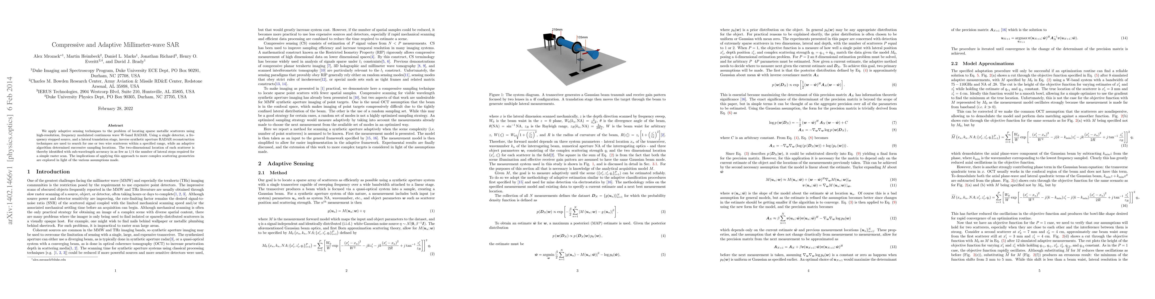 We apply adaptive sensing techniques to the problem of locating sparse metallic scatterers using high-resolution, frequency modulated continuous wave W-band RADAR. Using a single detector, a frequency stepped source, and a lateral translation stage, inverse synthetic aperture RADAR reconstruction techniques are used to search for one or two wire scatterers within a specified range, while an adaptive algorithm determined successive sampling locations. The two-dimensional location of each scatterer is thereby identified with sub-wavelength accuracy in as few as 1/4 the number of lateral steps required for a simple raster scan. The implications of applying this approach to more complex scattering geometries are explored in light of the various assumptions made.