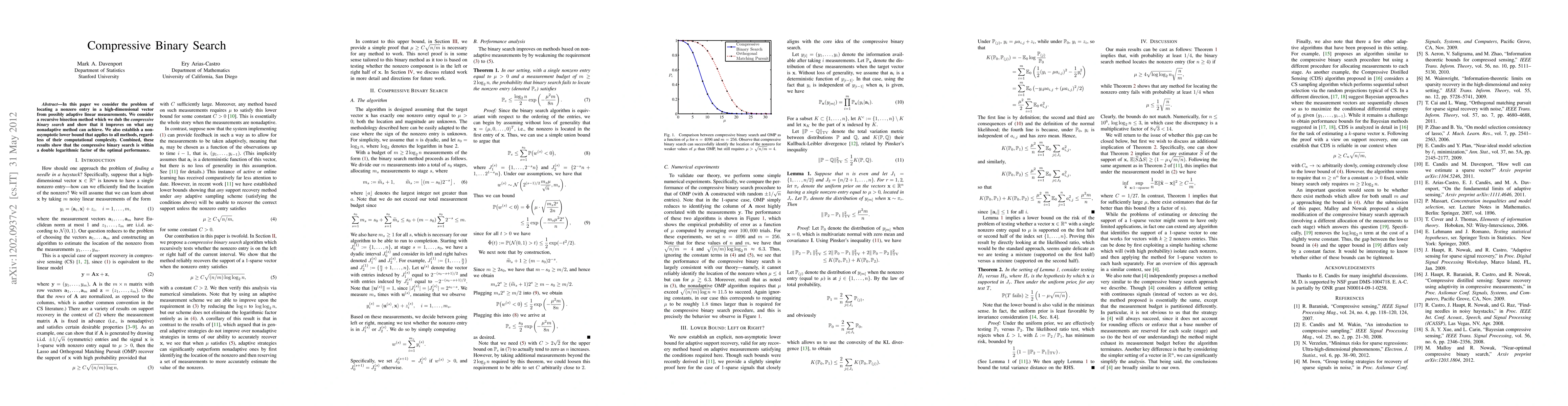 The compressive binary search improves on nonadaptive methods for locating a nonzero entry in high-dimensional vectors from adaptive linear measurements, achieving performance within a double logarithmic factor of the optimal bound.