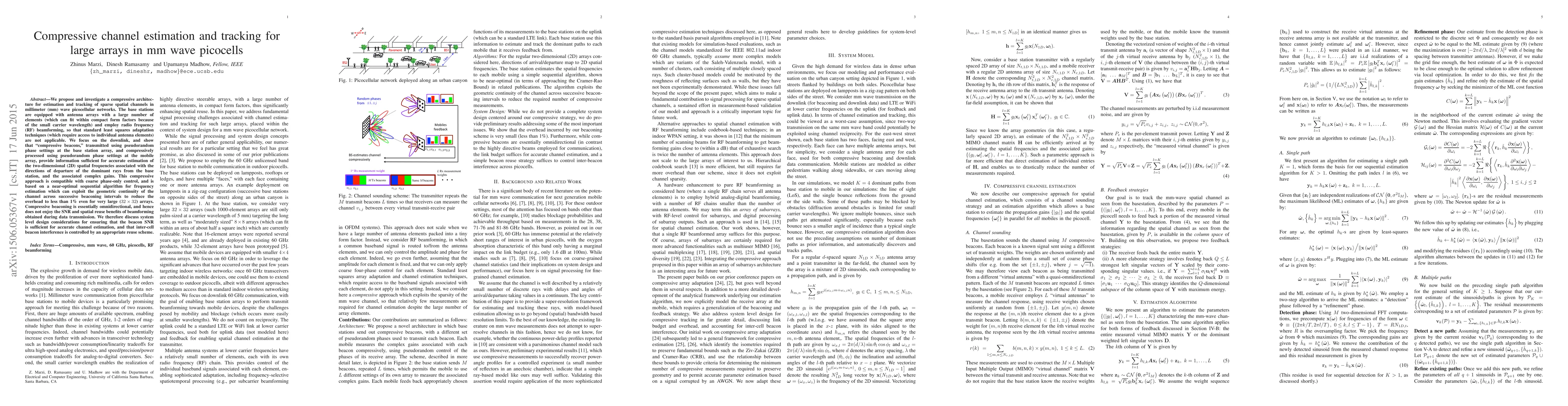 The paper proposes a compressive architecture for estimating and tracking sparse spatial channels in mmWave picocell networks using compressive beacons. This method is compatible with large antenna arrays and phase-only control, reducing overhead to less than 1% for large arrays like 32x32. It ensures sufficient beacon SNR for accurate channel estimation and manages inter-cell beacon interference through reuse schemes.