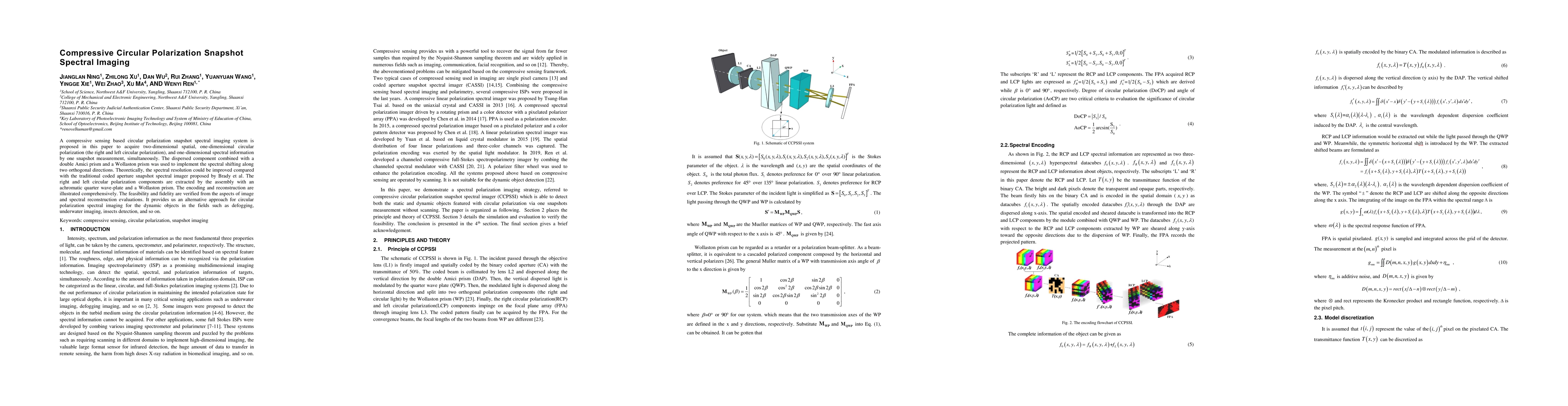 This paper proposes a compressive sensing-based circular polarization snapshot spectral imaging system that captures spatial, polarization, and spectral information in one integration. It employs an Amici and Wollaston prism combination to enhance spectral resolution and verifies feasibility through simulation, offering an alternative for applications like defogging and underwater imaging.
