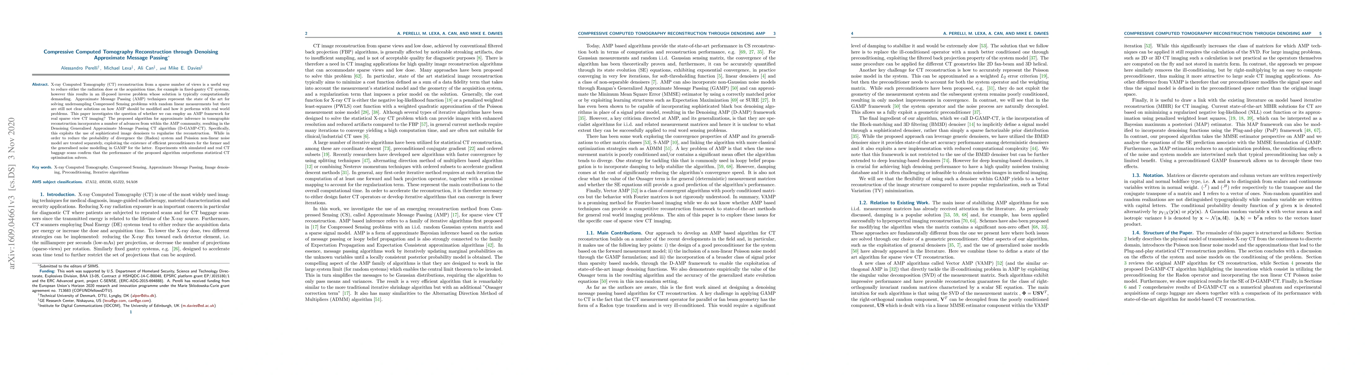 X-ray Computed Tomography (CT) reconstruction from a sparse number of views is a useful way to reduce either the radiation dose or the acquisition time, for example in fixed-gantry CT systems, however this results in an ill-posed inverse problem whose solution is typically computationally demanding. Approximate Message Passing (AMP) techniques represent the state of the art for solving under-sampling Compressed Sensing problems with random linear measurements but there are still not clear solutions on how AMP should be modified and how it performs with real world problems. This paper investigates the question of whether we can employ an AMP framework for real sparse view CT imaging? The proposed algorithm for approximate inference in tomographic reconstruction incorporates a number of advances from within the AMP community, resulting in the Denoising Generalized Approximate Message Passing CT algorithm (D-GAMP-CT). Specifically, this exploits the use of sophisticated image denoisers to regularize the reconstruction. While in order to reduce the probability of divergence the (Radon) system and Poisson non-linear noise model are treated separately, exploiting the existence of efficient preconditioners for the former and the generalized noise modelling in GAMP for the latter. Experiments with simulated and real CT baggage scans confirm that the performance of the proposed algorithm outperforms statistical CT optimization solvers.