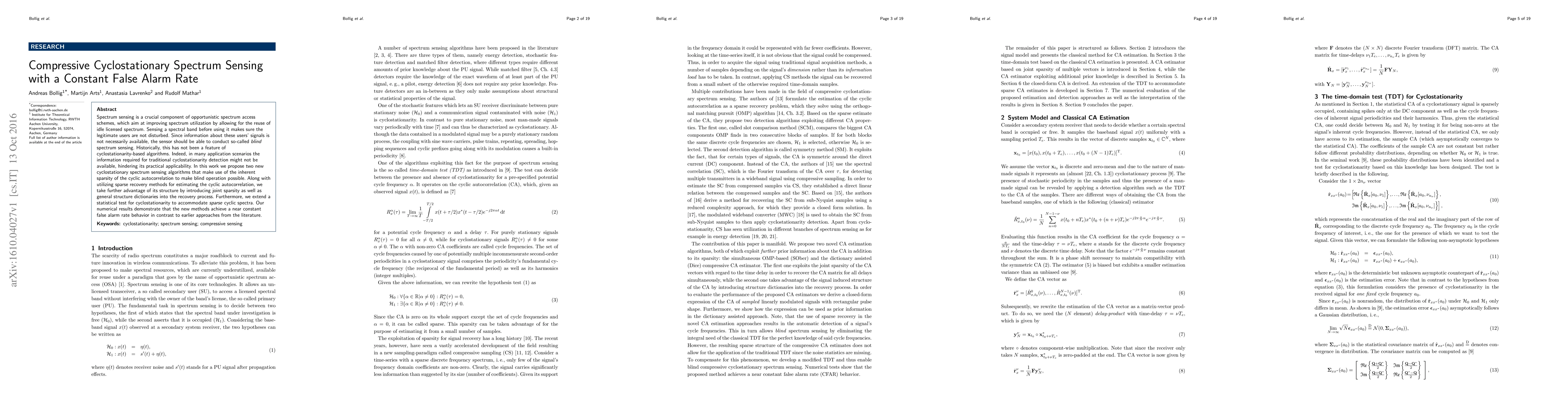 This paper proposes new cyclostationary spectrum sensing algorithms that enable blind detection of signals in idle spectrum bands using compressive sensing techniques. The methods achieve near constant false alarm rates and incorporate joint sparsity and general structure dictionaries to improve sensing accuracy.