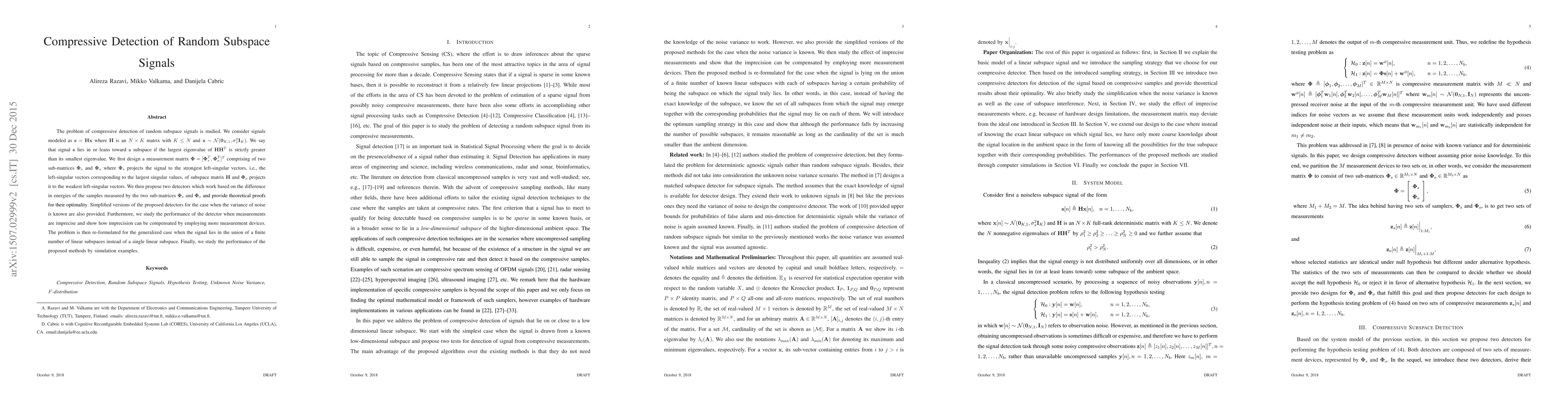 The problem of compressive detection of random subspace signals is studied. We consider signals modeled as $\mathbf{s} = \mathbf{H} \mathbf{x}$ where $\mathbf{H}$ is an $N \times K$ matrix with $K \le N$ and $\mathbf{x} \sim \mathcal{N}(\mathbf{0}_{K,1},\sigma_x^2 \mathbf{I}_K)$. We say that signal $\mathbf{s}$ lies in or leans toward a subspace if the largest eigenvalue of $\mathbf{H} \mathbf{H}^T$ is strictly greater than its smallest eigenvalue. We first design a measurement matrix $\mathbf{\Phi}=[\mathbf{\Phi}_s^T,\mathbf{\Phi}_o^T]^T$ comprising of two sub-matrices $\mathbf{\Phi}_s$ and $\mathbf{\Phi}_o$ where $\mathbf{\Phi}_s$ projects the signals to the strongest left-singular vectors, i.e., the left-singular vectors corresponding to the largest singular values, of subspace matrix $\mathbf{H}$ and $\mathbf{\Phi}_o$ projects it to the weakest left-singular vectors. We then propose two detectors which work based on the difference in energies of the samples measured by two sub-matrices $\mathbf{\Phi}_s$ and $\mathbf{\Phi}_o$ and prove their optimality. Simplified versions of the proposed detectors for the case when the variance of noise is known are also provided. Furthermore, we study the performance of the detector when measurements are imprecise and show how imprecision can be compensated by employing more measurement devices. The problem is then re-formulated for the case when the signal lies in the union of a finite number of linear subspaces instead of a single linear subspace. Finally, we study the performance of the proposed methods by simulation examples.