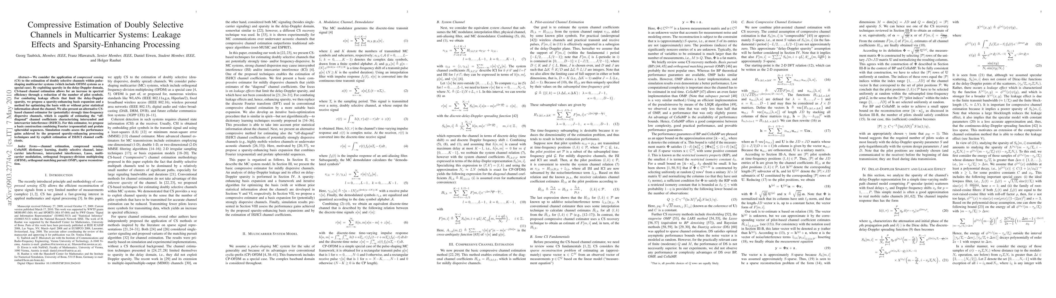 This paper proposes compressed sensing techniques for estimating doubly selective channels in multicarrier systems, focusing on reducing pilot symbols and combating leakage effects. It introduces a sparsity-enhancing basis expansion and an alternative estimator for intersymbol and intercarrier interference, achieving performance gains through simulations.