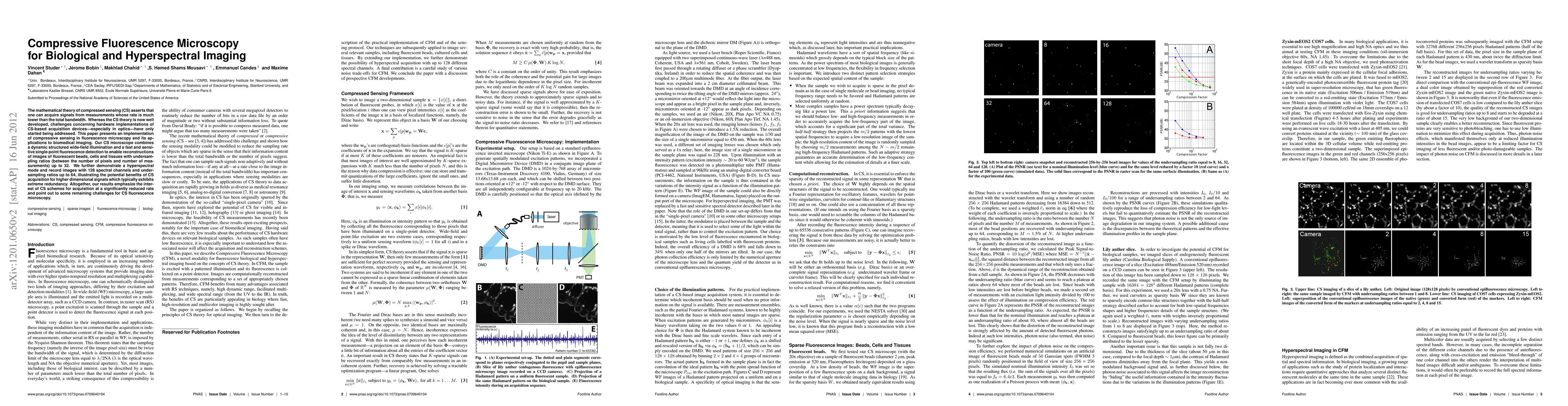 This paper presents a compressive sensing-based fluorescence microscopy system that enables high-quality imaging of biological samples with significant undersampling, achieving reconstructions up to 32:1. It also demonstrates hyperspectral imaging with 128 spectral channels and undersampling ratios up to 64, highlighting the potential of CS for high-dimensional data.