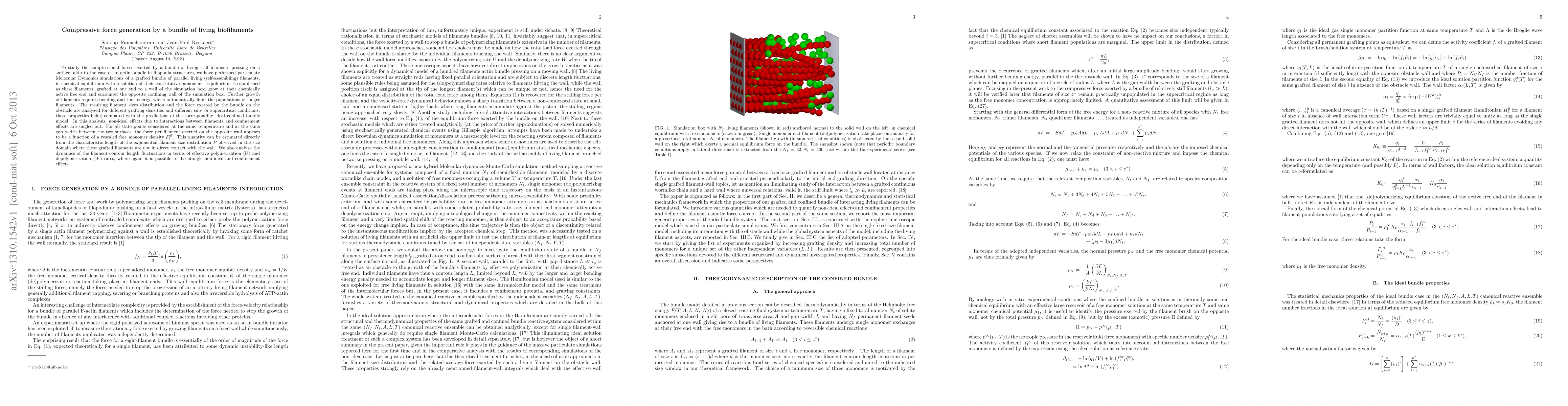 This study investigates the compressive forces generated by a bundle of living biofilaments using molecular dynamics simulations. The simulations reveal the filament size distribution and forces exerted by the bundle, highlighting the effects of filament interactions and confinement, and showing that the force per filament depends on the rescaled free monomer density.