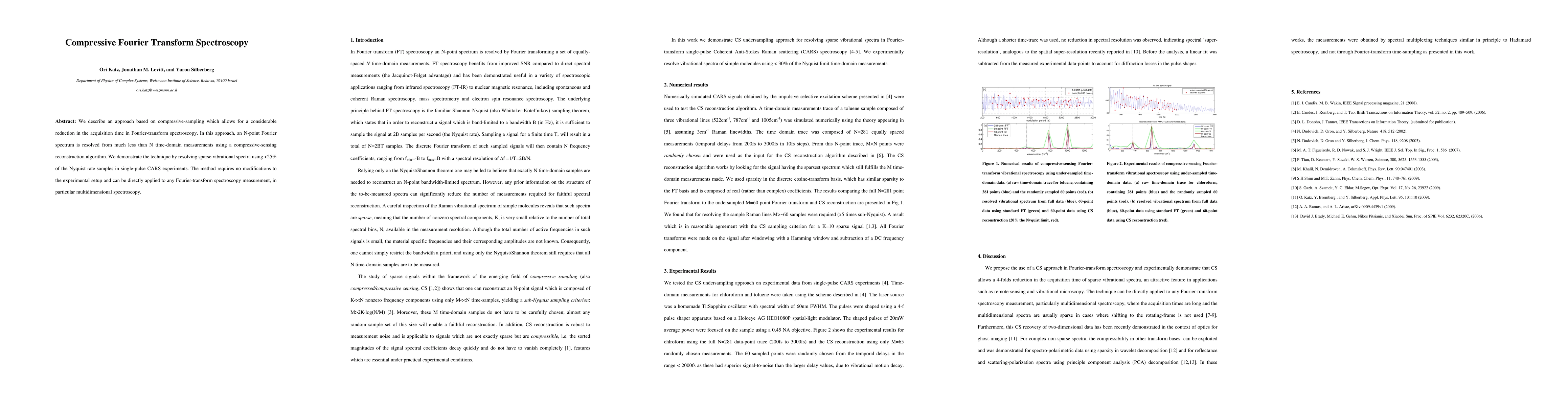 Compressive Fourier Transform Spectroscopy leverages compressive sampling to drastically reduce acquisition time in Fourier-transform spectroscopy, reconstructing an N-point spectrum from less than N time-domain measurements using compressive-sensing algorithms. Demonstrated in single-pulse CARS experiments, the method requires no experimental setup changes and is applicable to various Fourier-transform spectroscopy techniques, including multidimensional spectroscopy.