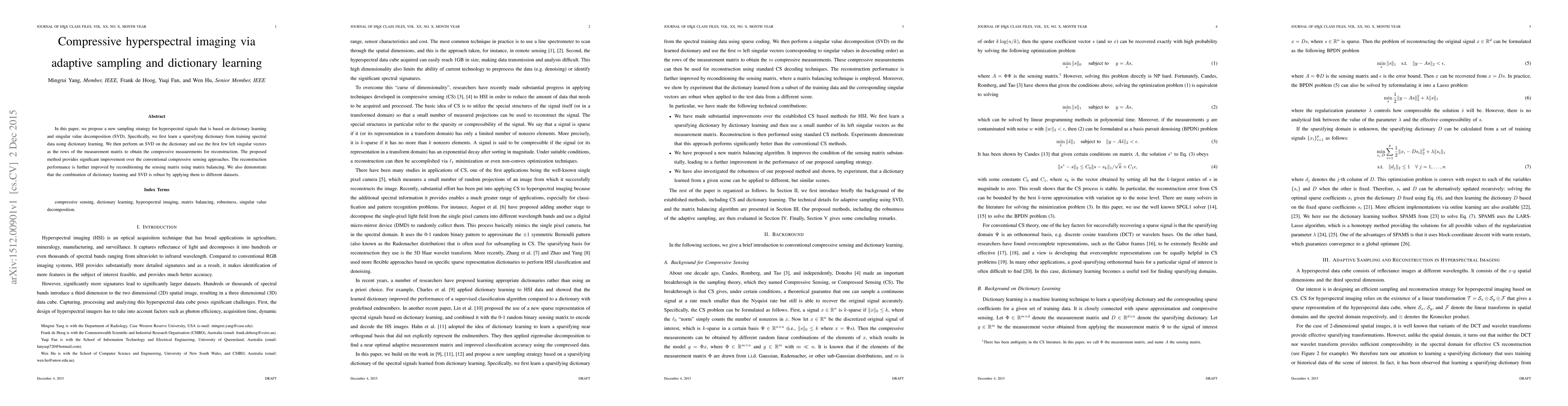 This paper introduces a novel adaptive sampling strategy for hyperspectral imaging using dictionary learning and SVD, which significantly enhances reconstruction performance compared to conventional methods. The method involves learning a sparsifying dictionary, performing SVD on it, and reconditioning the sensing matrix for improved reconstruction.