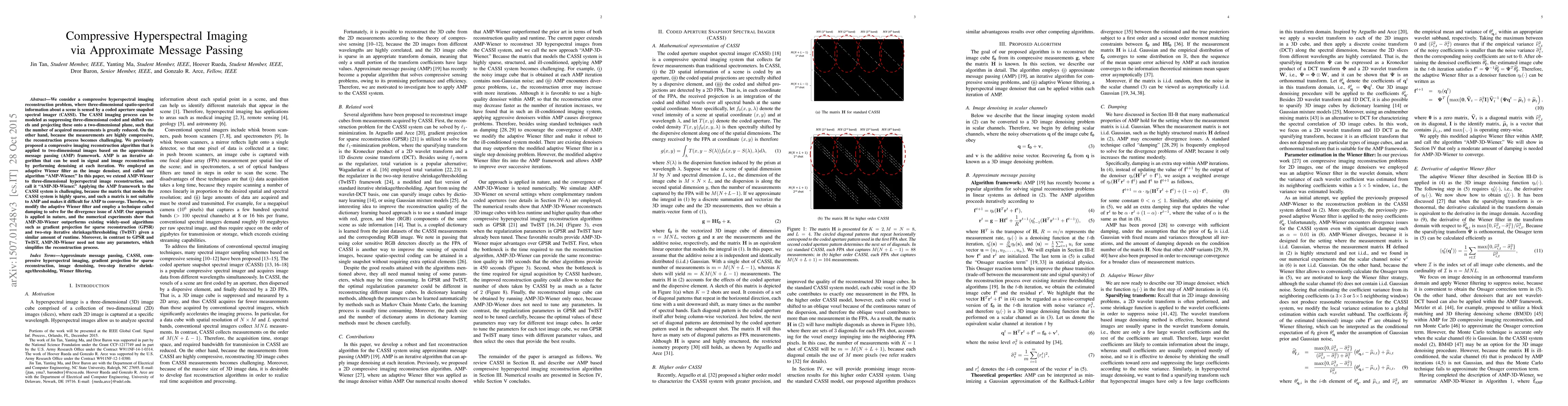 This paper extends the approximate message passing (AMP) framework to reconstruct three-dimensional hyperspectral images from highly compressive measurements using a coded aperture snapshot spectral imager (CASSI). The proposed AMP-3D-Wiener algorithm modifies the adaptive Wiener filter and employs damping to address convergence issues, outperforming existing algorithms in reconstruction quality without requiring parameter tuning.