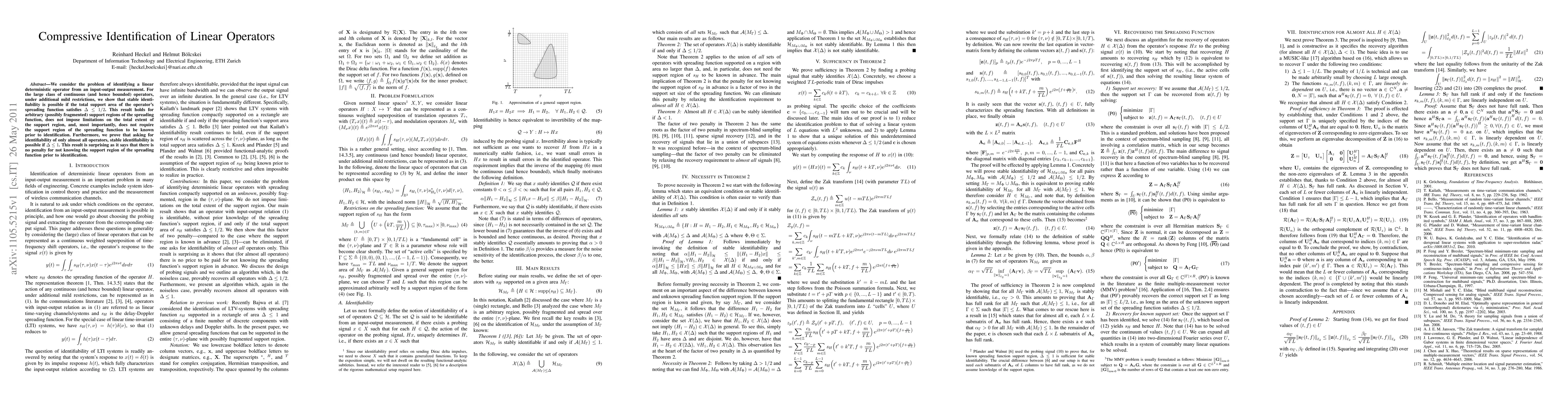 We consider the problem of identifying a linear deterministic operator from an input-output measurement. For the large class of continuous (and hence bounded) operators, under additional mild restrictions, we show that stable identifiability is possible if the total support area of the operator's spreading function satisfies D <= 1/2. This result holds for arbitrary (possibly fragmented) support regions of the spreading function, does not impose limitations on the total extent of the support region, and, most importantly, does not require the support region of the spreading function to be known prior to identification. Furthermore, we prove that asking for identifiability of only almost all operators, stable identifiability is possible if D <= 1. This result is surprising as it says that there is no penalty for not knowing the support region of the spreading function prior to identification.