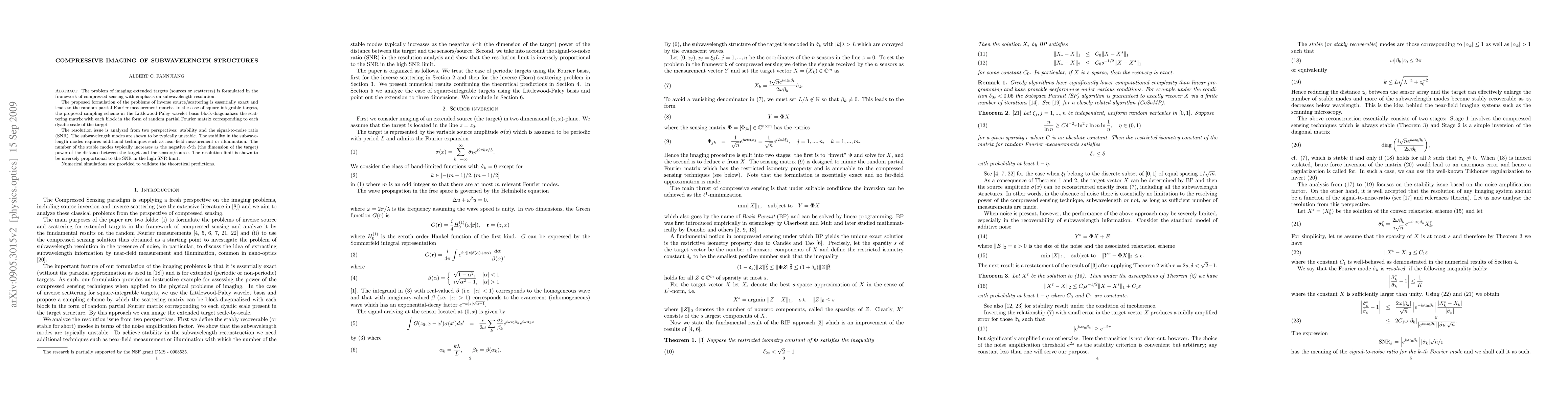 The problem of imaging extended targets (sources or scatterers) is formulated in the framework of compressed sensing with emphasis on subwavelength resolution. The proposed formulation of the problems of inverse source/scattering is essentially exact and leads to the random partial Fourier measurement matrix. In the case of square-integrable targets, the proposed sampling scheme in the Littlewood-Paley wavelet basis block-diagonalizes the scattering matrix with each block in the form of random partial Fourier matrix corresponding to each dyadic scale of the target. The resolution issue is analyzed from two perspectives: stability and the signal-to-noise ratio (SNR). The subwavelength modes are shown to be typically unstable. The stability in the subwavelength modes requires additional techniques such as near-field measurement or illumination. The number of the stable modes typically increases as the negative $d$-th (the dimension of the target) power of the distance between the target and the sensors/source. The resolution limit is shown to be inversely proportional to the SNR in the high SNR limit. Numerical simulations are provided to validate the theoretical predictions.