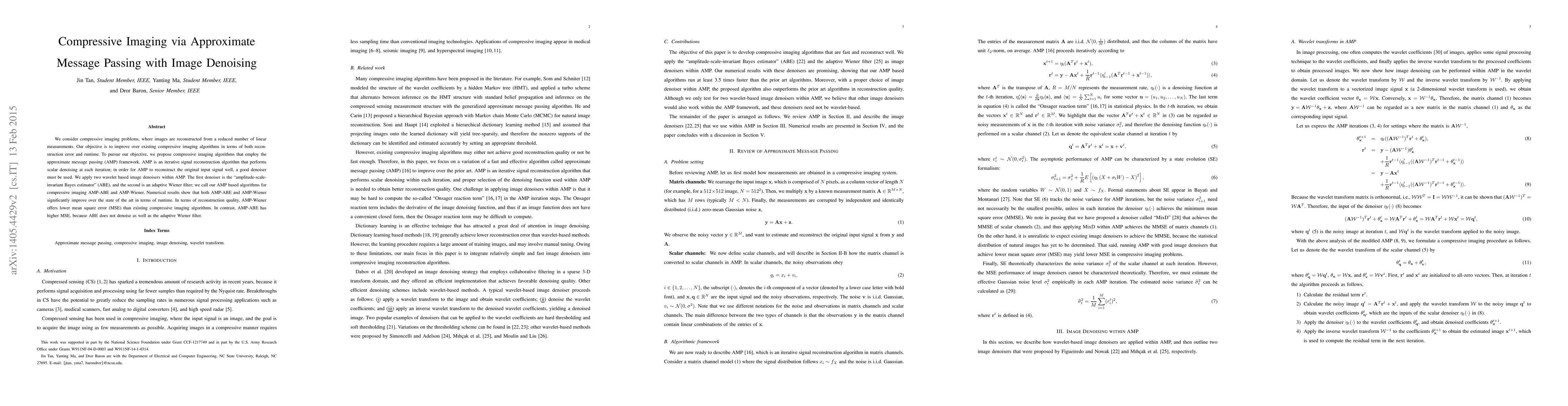 This paper proposes two compressive imaging algorithms, AMP-ABE and AMP-Wiener, using the approximate message passing framework with wavelet-based denoisers. AMP-Wiener, employing an adaptive Wiener filter, outperforms existing methods in terms of runtime and reconstruction quality, while AMP-ABE, using the amplitude-scale invariant Bayes estimator, has higher reconstruction error due to inferior denoising performance.