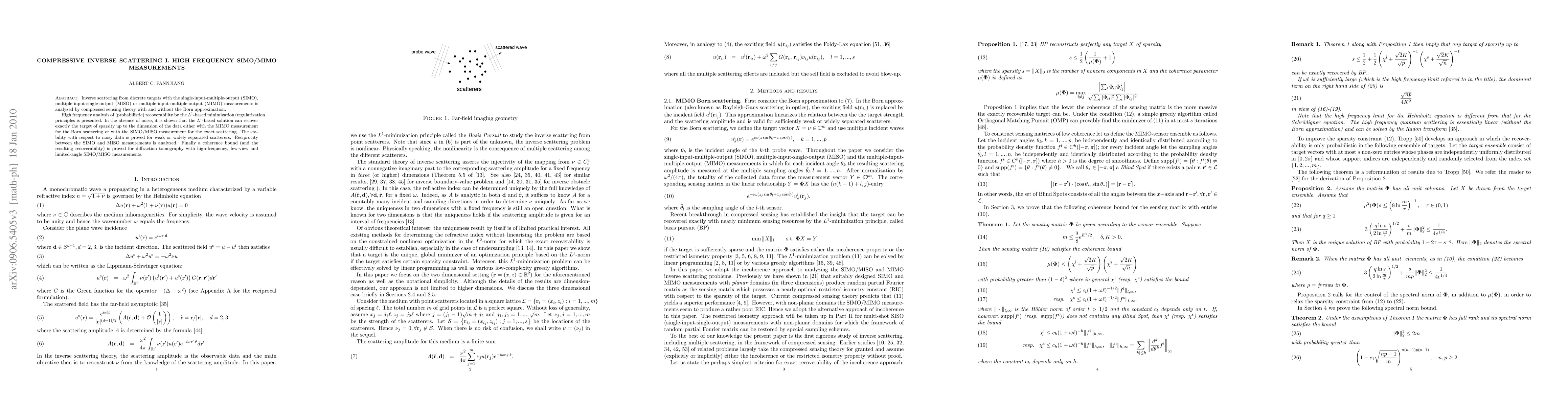 Researchers analyze high-frequency inverse scattering using compressed sensing theory for multiple input-output measurement methods, showing exact recovery of targets up to data dimensionality with minimal noise and stability in noisy conditions.