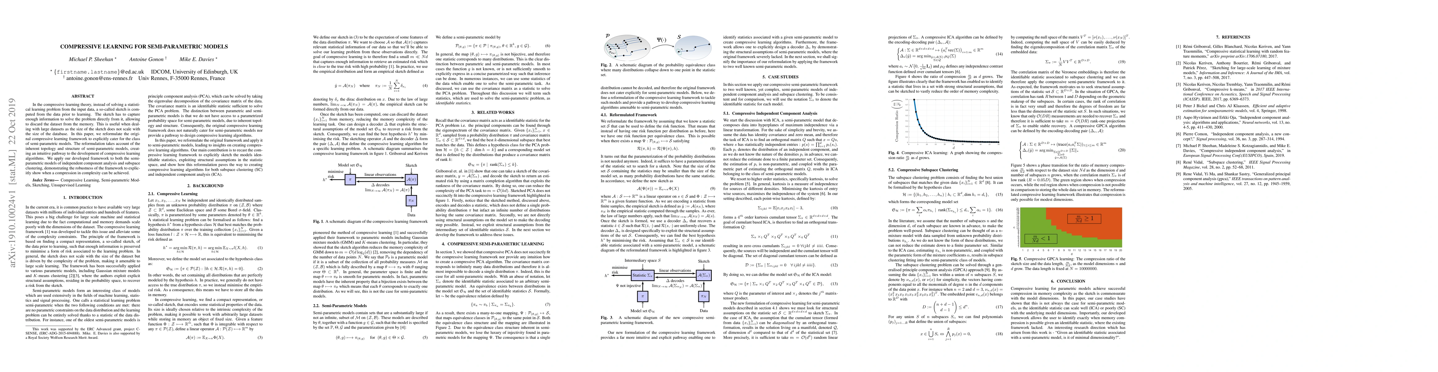 In the compressive learning theory, instead of solving a statistical learning problem from the input data, a so-called sketch is computed from the data prior to learning. The sketch has to capture enough information to solve the problem directly from it, allowing to discard the dataset from the memory. This is useful when dealing with large datasets as the size of the sketch does not scale with the size of the database. In this paper, we reformulate the original compressive learning framework to explicitly cater for the class of semi-parametric models. The reformulation takes account of the inherent topology and structure of semi-parametric models, creating an intuitive pathway to the development of compressive learning algorithms. We apply our developed framework to both the semi-parametric models of independent component analysis and subspace clustering, demonstrating the robustness of the framework to explicitly show when a compression in complexity can be achieved.