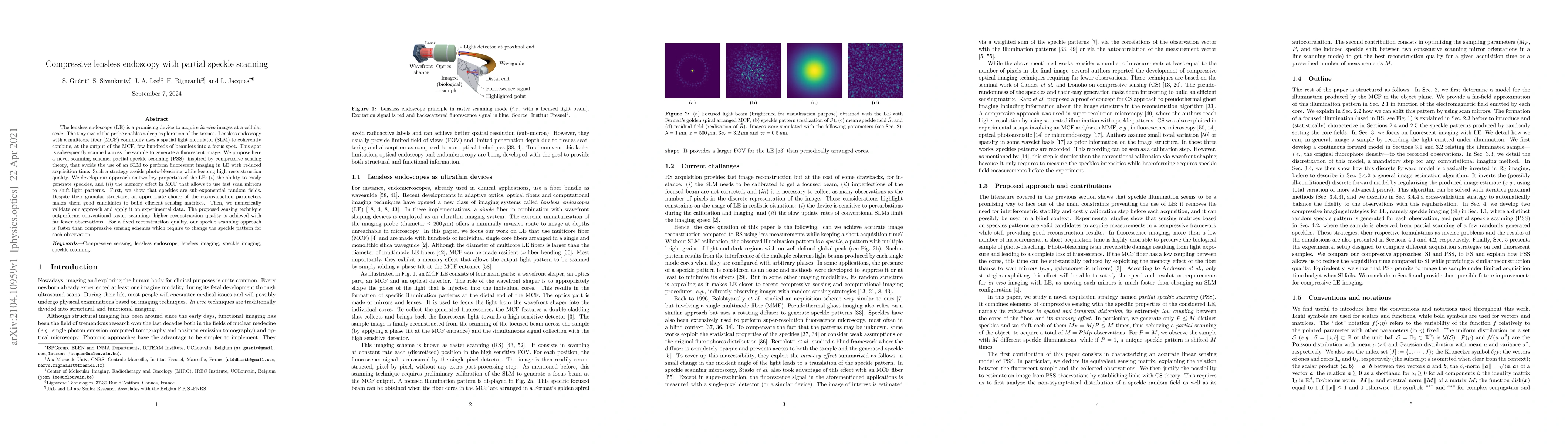 This paper proposes a novel partial speckle scanning technique for lensless endoscopy that leverages compressive sensing to achieve high-quality fluorescent imaging with reduced acquisition time, avoiding photo-bleaching. The method utilizes the natural speckle patterns and memory effect in multicore fibers, demonstrating faster and more efficient image reconstruction compared to conventional raster scanning.