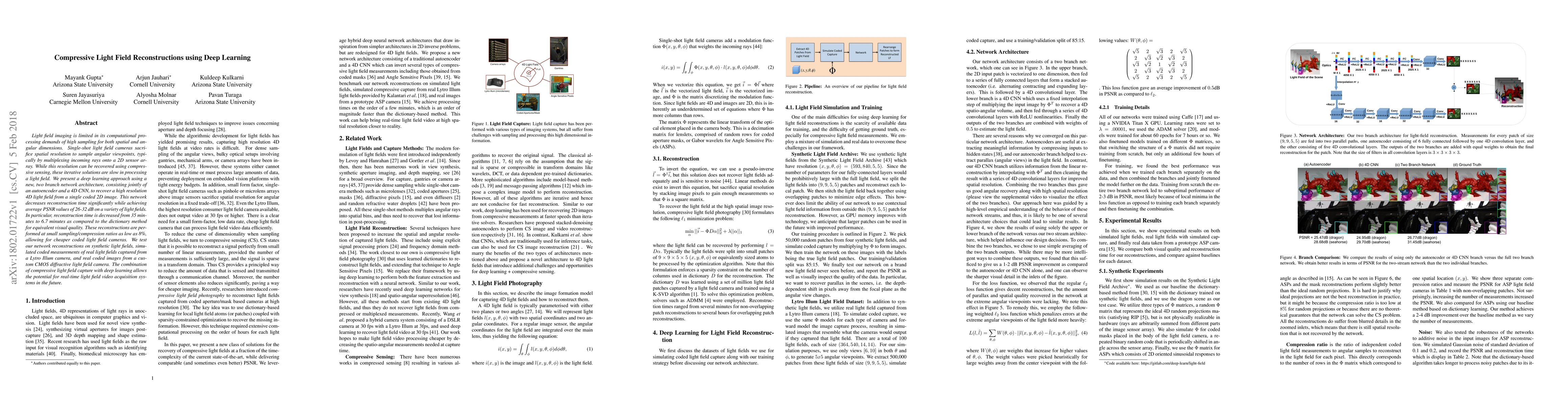 This paper proposes a deep learning method using a two-branch network combining an autoencoder and 4D CNN to reconstruct high-resolution light fields from single coded 2D images, significantly reducing reconstruction time from 35 minutes to 6.7 minutes while maintaining visual quality. The approach enables real-time light field video acquisition.