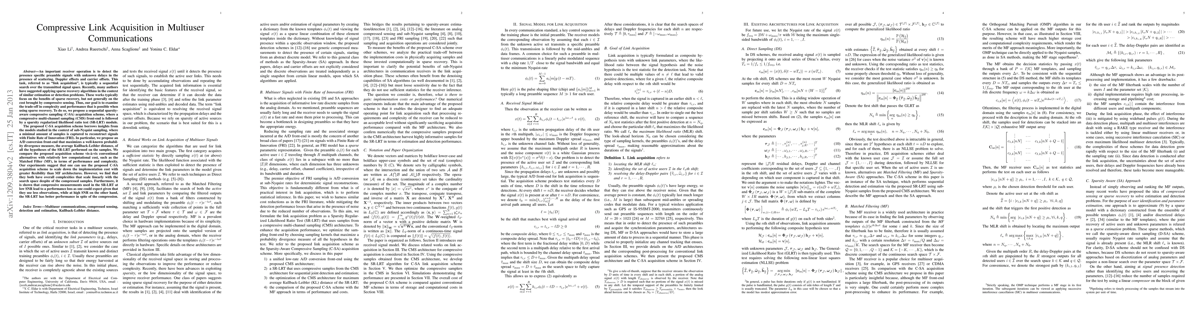 This work distinguishes itself by focusing on the trade-off between complexity and performance in link acquisition, proposing a sequential sparsity-aware compressive sampling (C-SA) acquisition scheme that integrates a compressive multi-channel sampling (CMS) front-end with a sparsity regularized likelihood ratio test (SR-LRT) module. The optimization of the sampling kernels {ψp(t)}Pp=1 as linear combinations of MF templates and the introduction of an optimal B matrix design to maximize the average KL distance among hypotheses tested in the SR-LRT are key novel contributions.