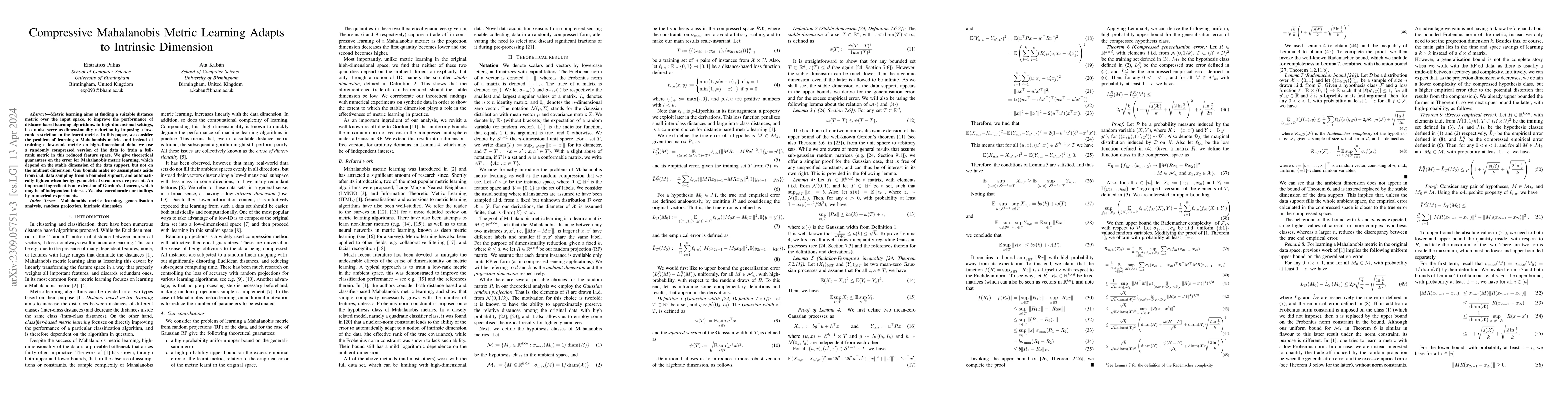 This paper proposes a method for Mahalanobis metric learning that adapts to intrinsic dimensionality by training a full-rank metric on compressed data, providing theoretical error bounds based on stable data support rather than ambient dimension. Numerical experiments validate the effectiveness of the approach.