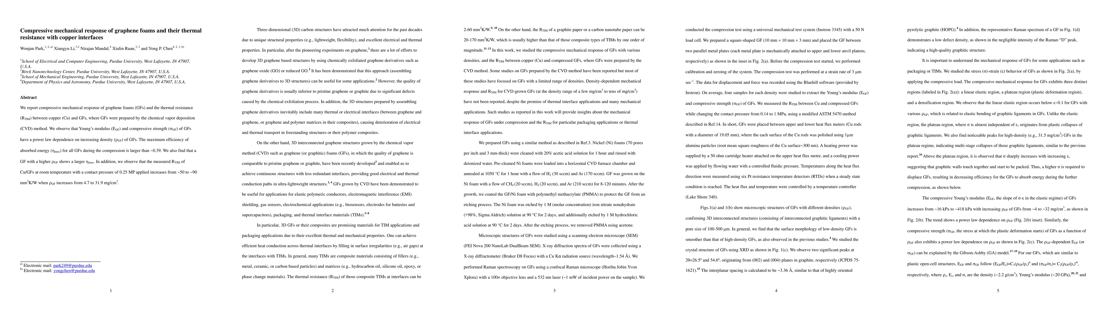 The research examines graphene foams' compressive mechanical properties, revealing a power-law relationship between Young's modulus, compressive strength, and density. Thermal interface resistance between copper and graphene foams is also studied, increasing with foam density. Maximum energy absorption efficiency is consistently above 0.39 for all foams.