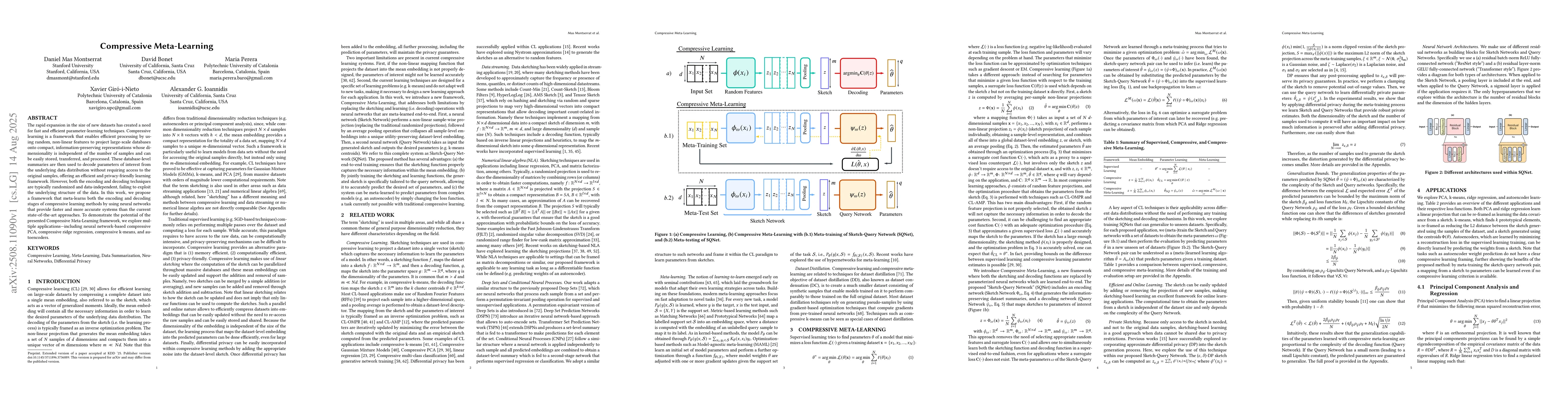 The rapid expansion in the size of new datasets has created a need for fast and efficient parameter-learning techniques. Compressive learning is a framework that enables efficient processing by using random, non-linear features to project large-scale databases onto compact, information-preserving representations whose dimensionality is independent of the number of samples and can be easily stored, transferred, and processed. These database-level summaries are then used to decode parameters of interest from the underlying data distribution without requiring access to the original samples, offering an efficient and privacy-friendly learning framework. However, both the encoding and decoding techniques are typically randomized and data-independent, failing to exploit the underlying structure of the data. In this work, we propose a framework that meta-learns both the encoding and decoding stages of compressive learning methods by using neural networks that provide faster and more accurate systems than the current state-of-the-art approaches. To demonstrate the potential of the presented Compressive Meta-Learning framework, we explore multiple applications -- including neural network-based compressive PCA, compressive ridge regression, compressive k-means, and autoencoders.
