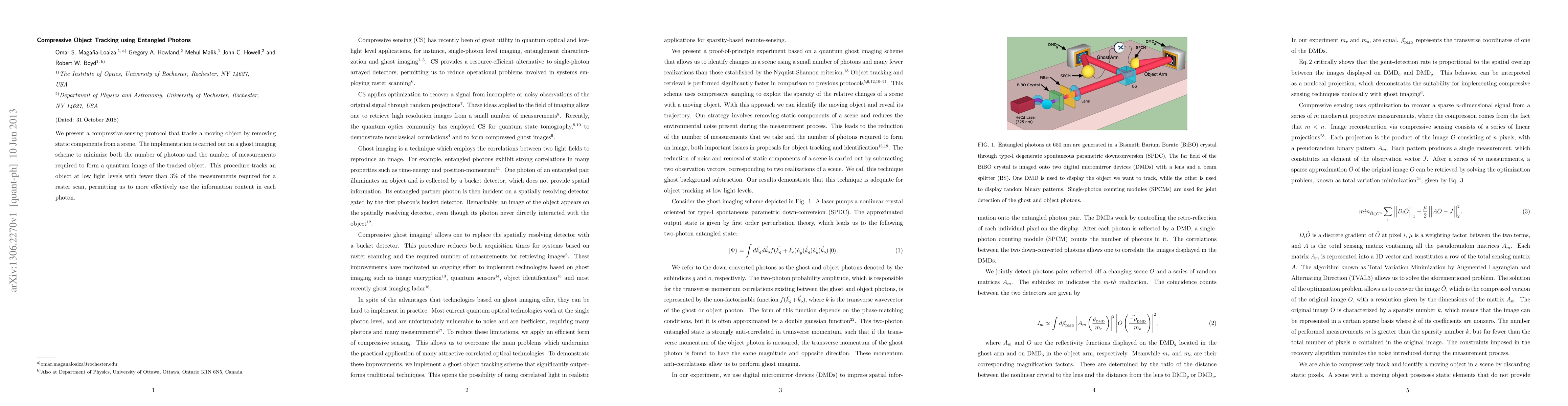 This paper proposes a compressive sensing protocol for object tracking using entangled photons, achieving ghost imaging with significantly fewer measurements and photons compared to traditional methods, thereby enhancing efficiency in low light conditions.