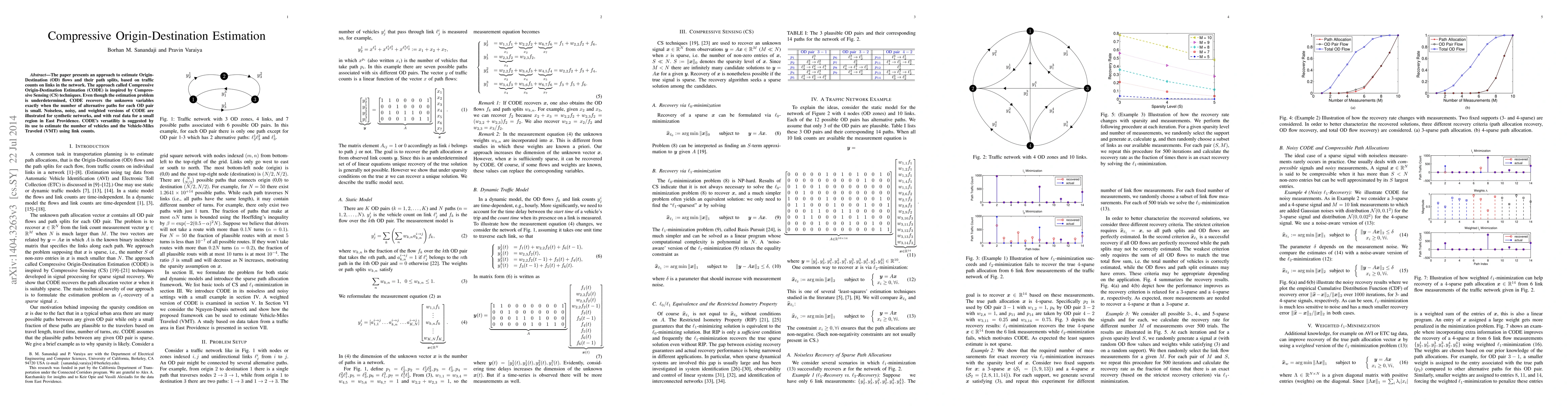 The paper introduces Compressive Origin-Destination Estimation (CODE), an approach inspired by Compressive Sensing to estimate OD flows and path splits using link traffic counts. CODE accurately recovers unknown OD variables when alternative paths are limited, demonstrated through synthetic and real-world data.