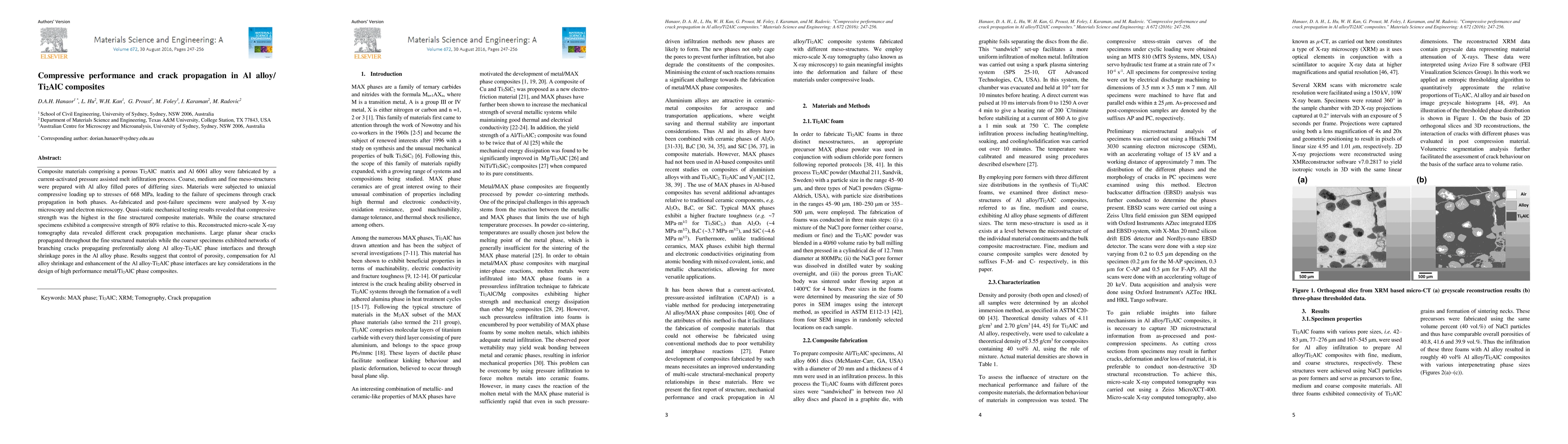 Composite materials comprising a porous Ti2AlC matrix and Al 6061 alloy were fabricated by a current-activated pressure assisted melt infiltration process. Coarse, medium and fine meso-structures were prepared with Al alloy filled pores of differing sizes. Materials were subjected to uniaxial compressive loading up to stresses of 668 MPa, leading to the failure of specimens through crack propagation in both phases. As-fabricated and post-failure specimens were analysed by X-ray microscopy and electron microscopy. Quasi-static mechanical testing results revealed that compressive strength was the highest in the fine structured composite materials. While the coarse structured specimens exhibited a compressive strength of 80% relative to this. Reconstructed micro-scale X-ray tomography data revealed different crack propagation mechanisms. Large planar shear cracks propagated throughout the fine structured materials while the coarser specimens exhibited networks of branching cracks propagating preferentially along Al alloy-Ti2AlC phase interfaces and through shrinkage pores in the Al alloy phase. Results suggest that control of porosity, compensation for Al alloy shrinkage and enhancement of the Al alloy-Ti2AlC phase interfaces are key considerations in the design of high performance metal/Ti2AlC phase composites.