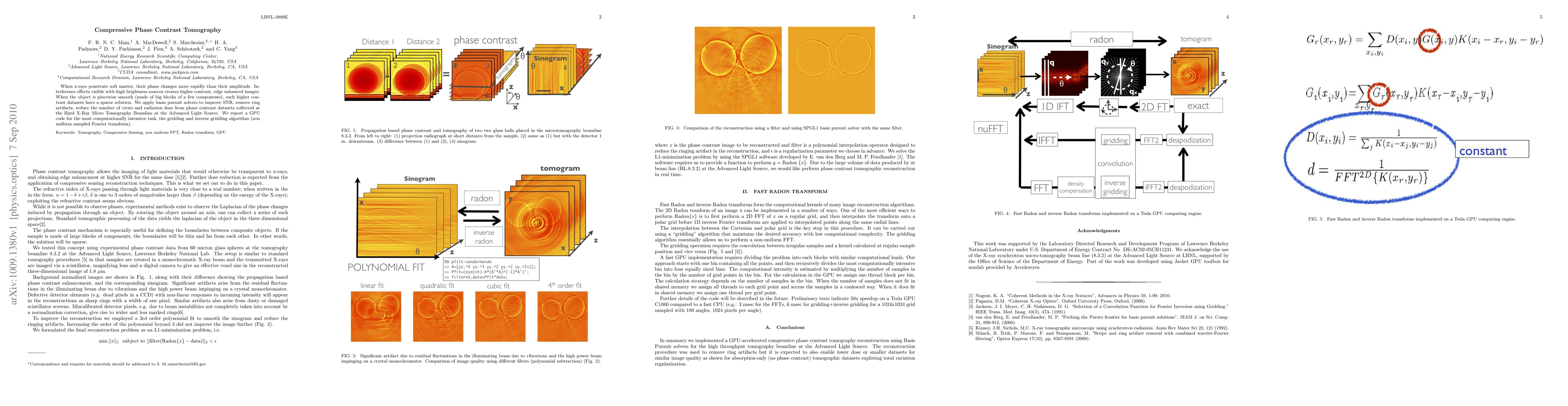 When x-rays penetrate soft matter, their phase changes more rapidly than their amplitude. In- terference effects visible with high brightness sources creates higher contrast, edge enhanced images. When the object is piecewise smooth (made of big blocks of a few components), such higher con- trast datasets have a sparse solution. We apply basis pursuit solvers to improve SNR, remove ring artifacts, reduce the number of views and radiation dose from phase contrast datasets collected at the Hard X-Ray Micro Tomography Beamline at the Advanced Light Source. We report a GPU code for the most computationally intensive task, the gridding and inverse gridding algorithm (non uniform sampled Fourier transform).