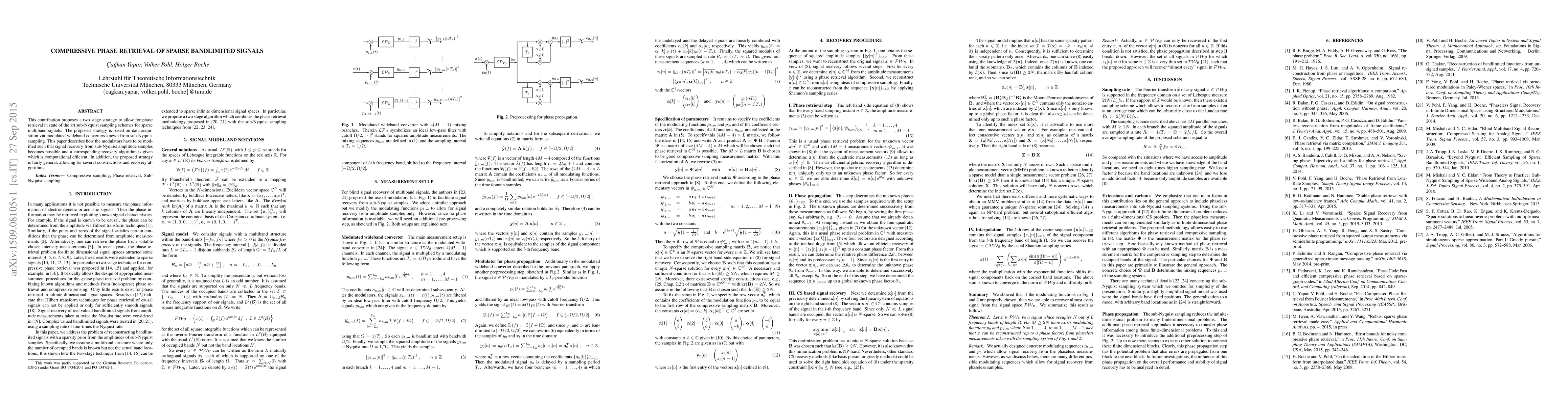 This contribution proposes a two stage strategy to allow for phase retrieval in state of the art sub-Nyquist sampling schemes for sparse multiband signals. The proposed strategy is based on data acquisition via modulated wideband converters known from sub-Nyquist sampling. This paper describes how the modulators have to be modified such that signal recovery from sub-Nyquist amplitude samples becomes possible and a corresponding recovery algorithm is given which is computational efficient. In addition, the proposed strategy is fairly general, allowing for several constructions and recovery algorithms.