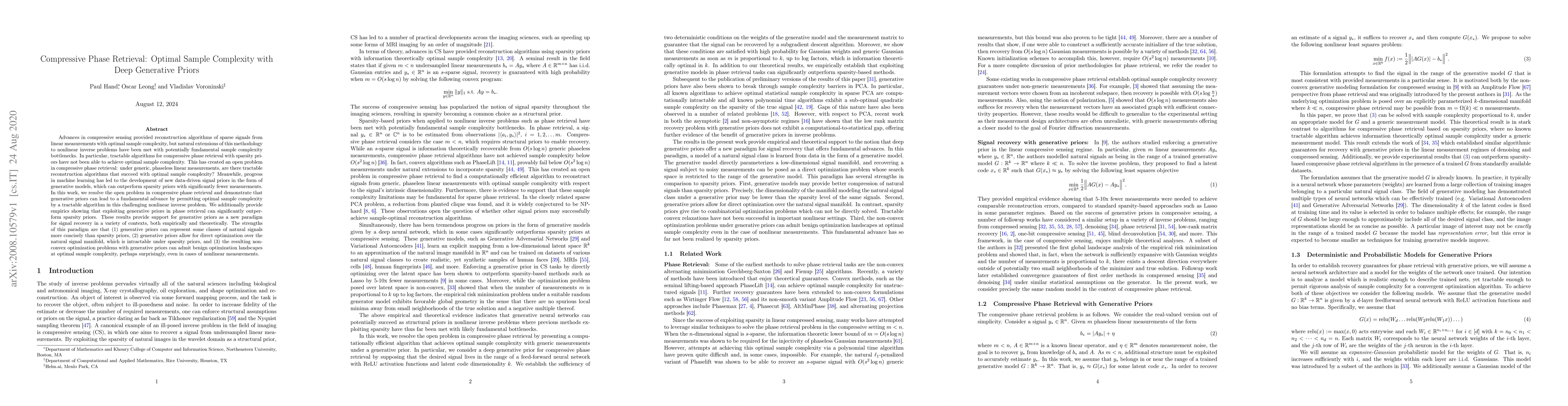This paper resolves the open problem in compressive phase retrieval by demonstrating that generative priors, derived from machine learning models, can achieve optimal sample complexity for reconstruction algorithms. It shows that generative priors outperform sparsity priors, offering a new paradigm for signal recovery that is both theoretically sound and empirically effective.