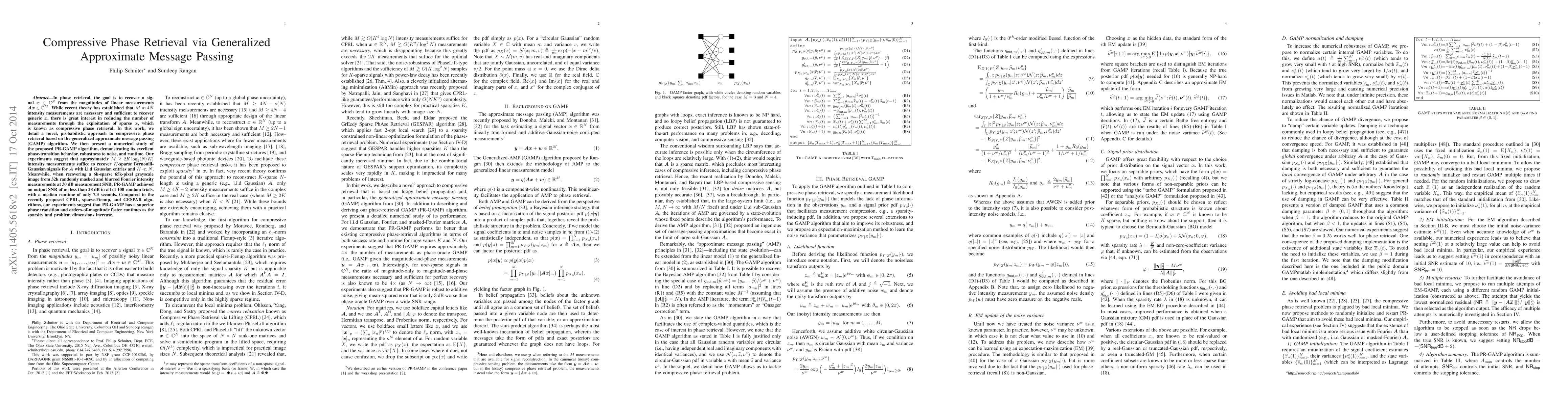 This paper proposes a novel probabilistic approach, PR-GAMP, for compressive phase retrieval based on the generalized approximate message passing algorithm. The study demonstrates that PR-GAMP can recover $K$-sparse signals with approximately $M\geq 2K\log_2(N/K)$ measurements, achieving superior phase-transition behavior and faster runtimes compared to other methods.