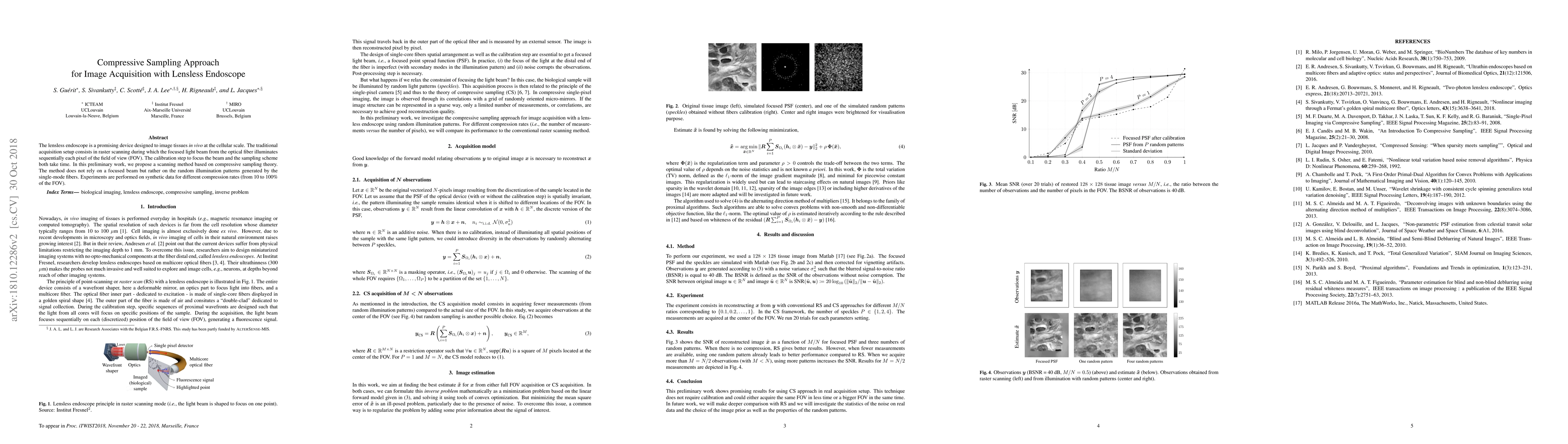 The lensless endoscope is a promising device designed to image tissues in vivo at the cellular scale. The traditional acquisition setup consists in raster scanning during which the focused light beam from the optical fiber illuminates sequentially each pixel of the field of view (FOV). The calibration step to focus the beam and the sampling scheme both take time. In this preliminary work, we propose a scanning method based on compressive sampling theory. The method does not rely on a focused beam but rather on the random illumination patterns generated by the single-mode fibers. Experiments are performed on synthetic data for different compression rates (from 10 to 100% of the FOV).