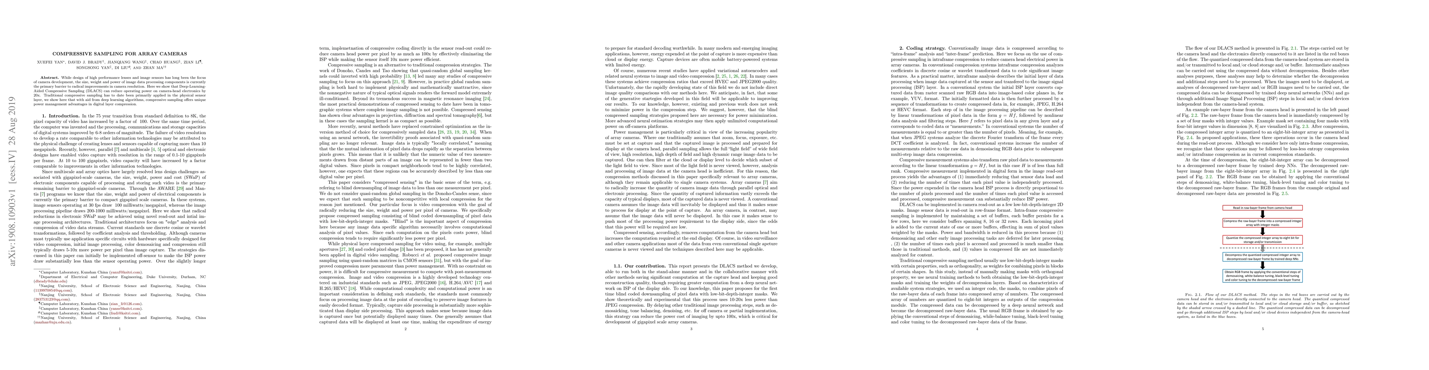 The paper presents a novel approach combining compressive sampling with deep learning for efficient digital layer compression, leading to significant power reduction in camera-head electronics.