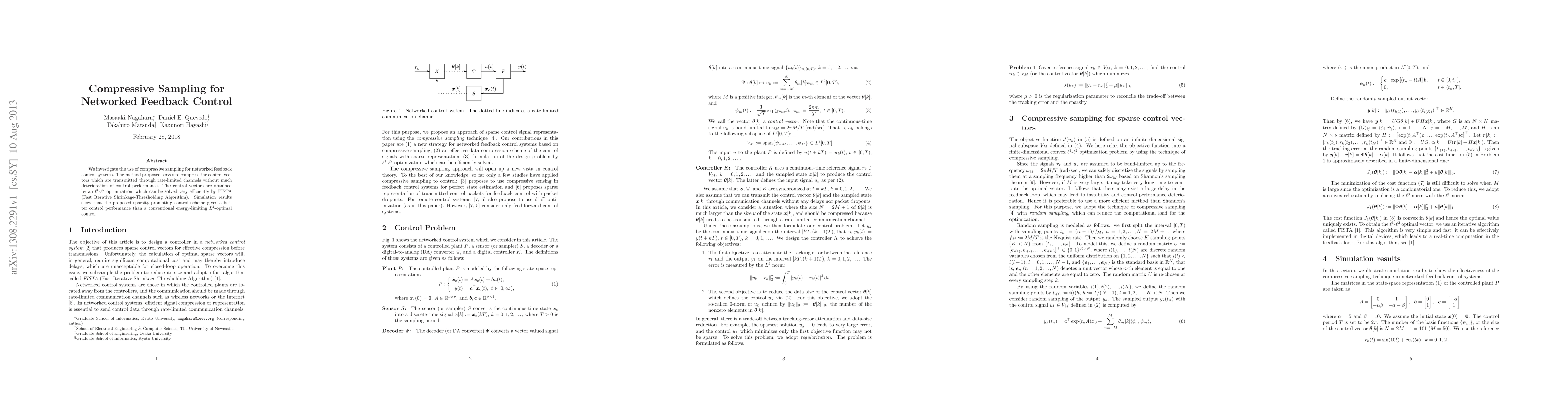 This paper proposes a compressive sampling method for networked feedback control systems, utilizing L1-L2 optimization and FISTA to efficiently compress control vectors transmitted over rate-limited channels. Simulation results demonstrate superior control performance compared to conventional L2-optimal control.