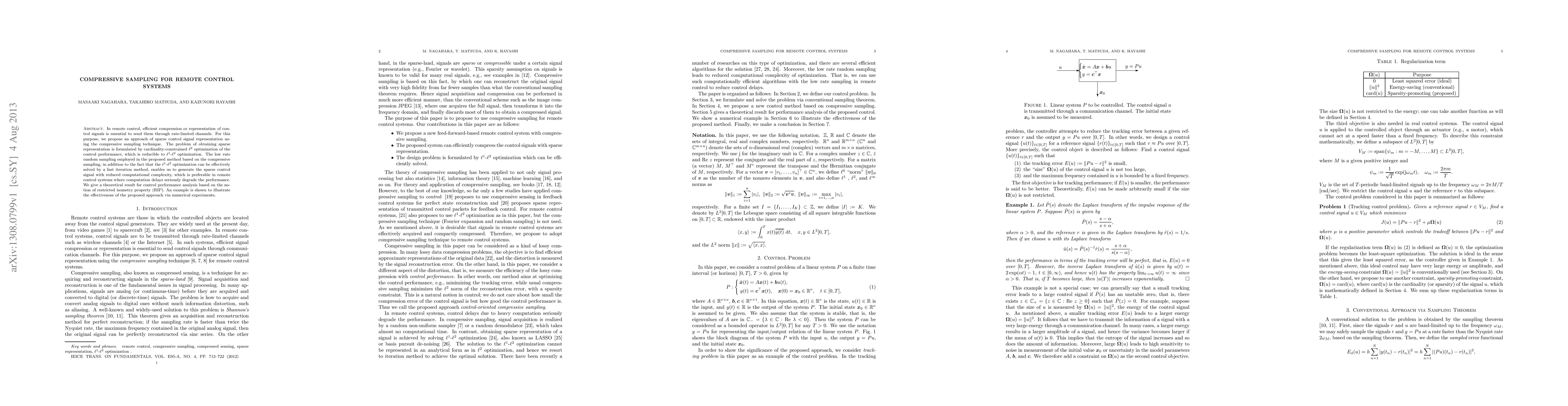 This paper proposes a compressive sampling technique for efficient representation of control signals in remote control systems, employing sparse signal representation and low-rate random sampling to reduce computational complexity. Theoretical analysis based on the restricted isometry property (RIP) supports the effectiveness of the method.