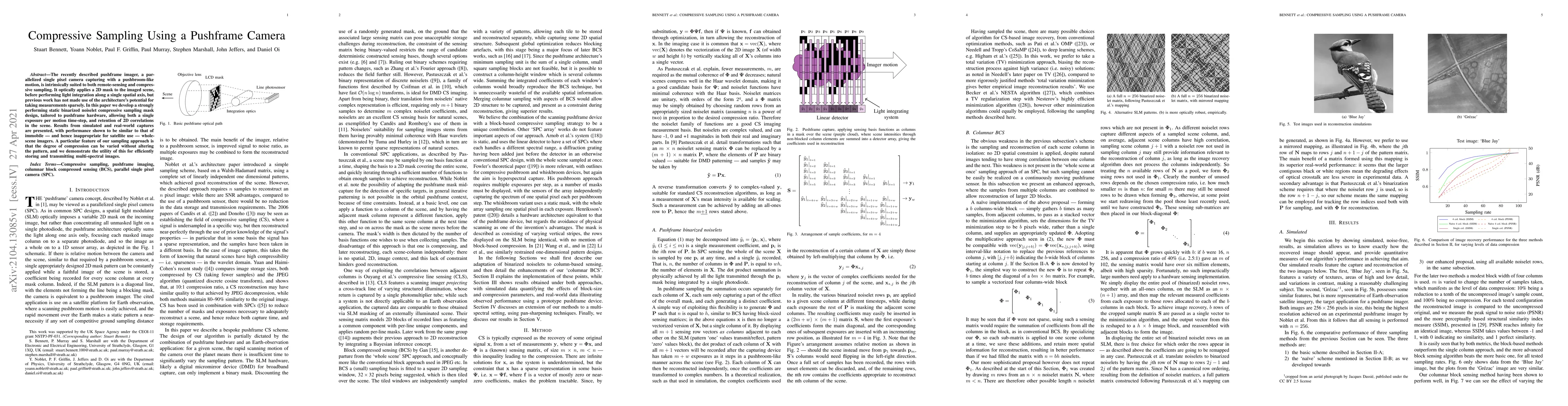 This paper develops a binarized noiselet compressive sampling mask for a pushframe camera, enabling sparse measurements and variable compression levels. The design allows single exposure per motion step while retaining 2D scene correlations, achieving performance comparable to whole-scene imagers, with efficient multi-spectral image storage and transmission.