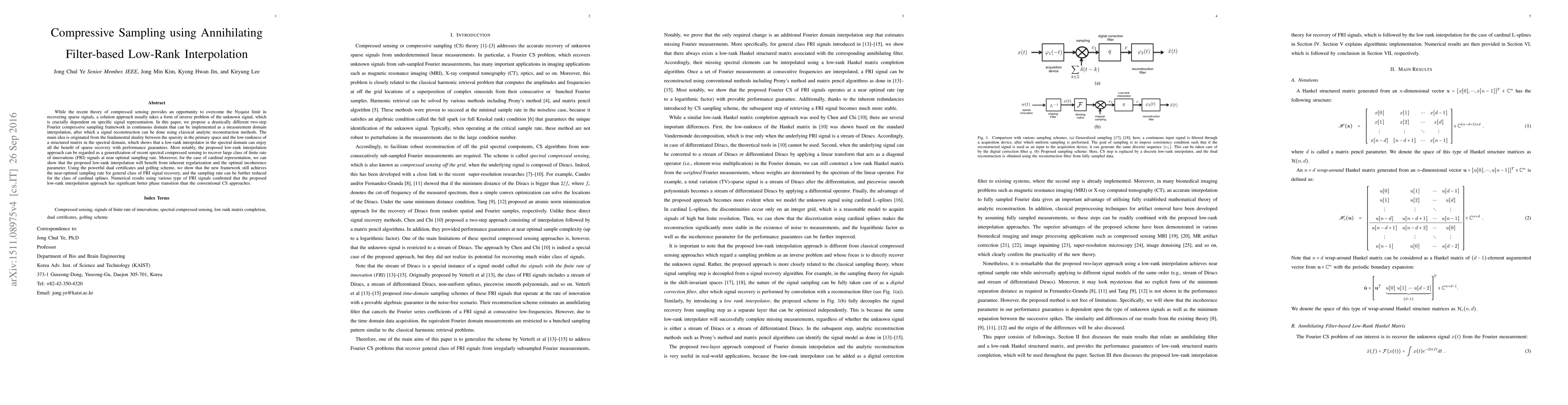 While the recent theory of compressed sensing provides an opportunity to overcome the Nyquist limit in recovering sparse signals, a solution approach usually takes a form of inverse problem of the unknown signal, which is crucially dependent on specific signal representation. In this paper, we propose a drastically different two-step Fourier compressive sampling framework in continuous domain that can be implemented as a measurement domain interpolation, after which a signal reconstruction can be done using classical analytic reconstruction methods. The main idea is originated from the fundamental duality between the sparsity in the primary space and the low-rankness of a structured matrix in the spectral domain, which shows that a low-rank interpolator in the spectral domain can enjoy all the benefit of sparse recovery with performance guarantees. Most notably, the proposed low-rank interpolation approach can be regarded as a generalization of recent spectral compressed sensing to recover large class of finite rate of innovations (FRI) signals at near optimal sampling rate. Moreover, for the case of cardinal representation, we can show that the proposed low-rank interpolation will benefit from inherent regularization and the optimal incoherence parameter. Using the powerful dual certificates and golfing scheme, we show that the new framework still achieves the near-optimal sampling rate for general class of FRI signal recovery, and the sampling rate can be further reduced for the class of cardinal splines. Numerical results using various type of FRI signals confirmed that the proposed low-rank interpolation approach has significant better phase transition than the conventional CS approaches.