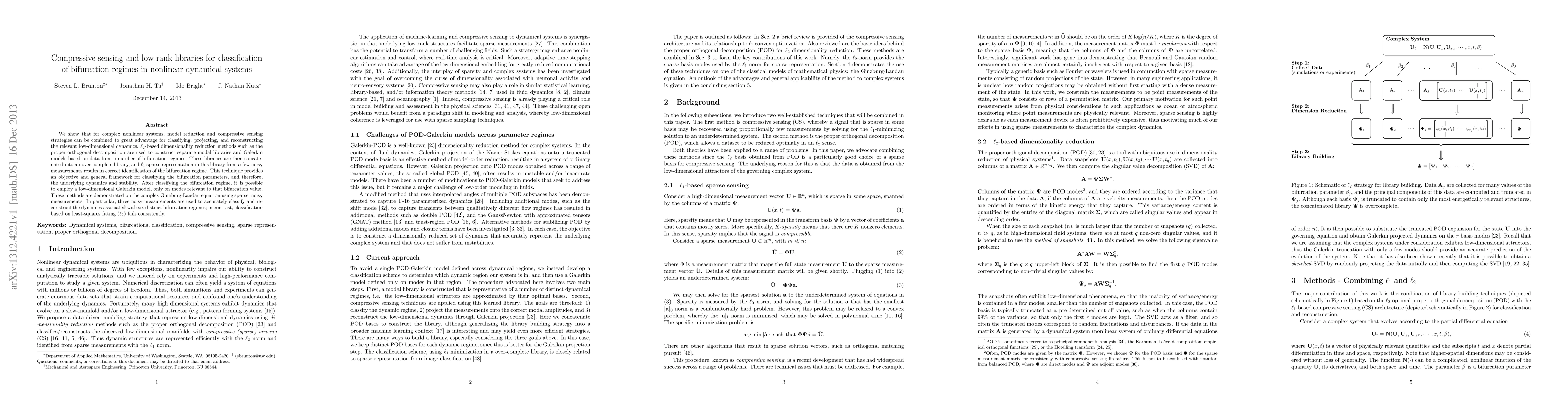 This paper combines compressive sensing and low-rank libraries for classifying bifurcation regimes in nonlinear dynamical systems. It demonstrates that $\ell_1$ sparse representation from few measurements can accurately identify bifurcation regimes, outperforming $\ell_2$ least-squares fitting, as shown through the classification of six regimes in the Ginzburg-Landau equation using only three noisy measurements.