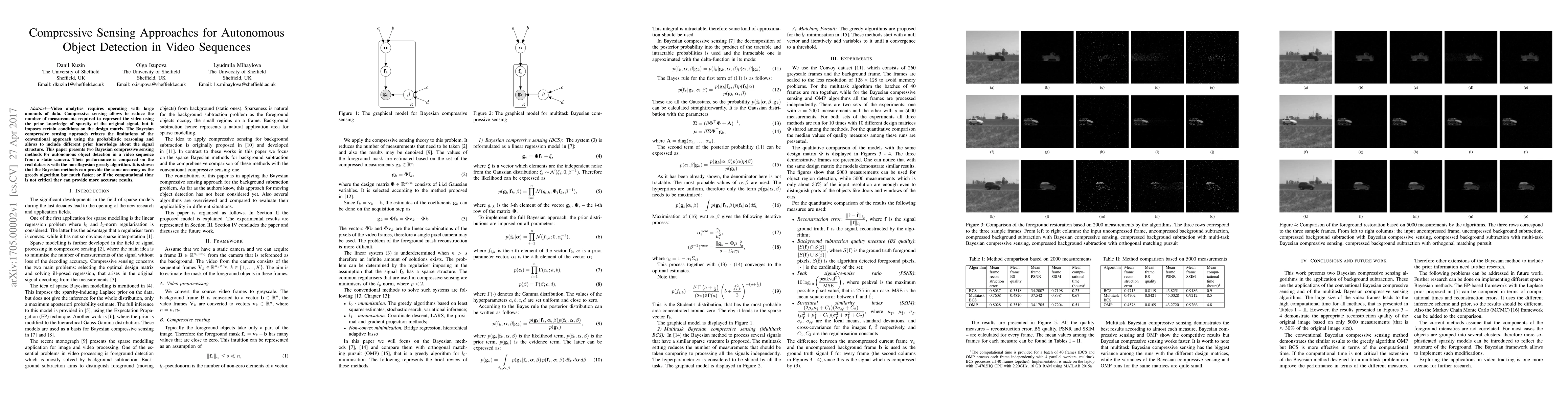 This paper introduces two Bayesian compressive sensing methods for autonomous object detection in video sequences, demonstrating their faster performance compared to a non-Bayesian greedy algorithm, and showing they can achieve similar or even greater accuracy depending on computational constraints.