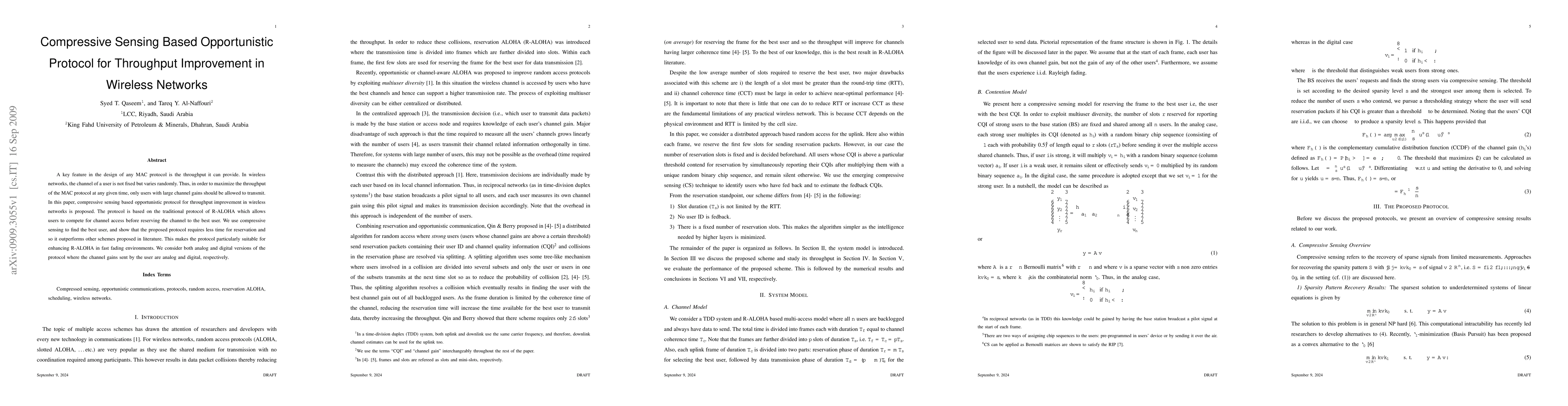 This paper proposes a compressive sensing based opportunistic protocol to enhance throughput in wireless networks by allowing only users with high channel gains to transmit. The protocol improves upon R-ALOHA by using compressive sensing to identify the best user, resulting in faster channel reservation and better performance in fast fading environments.