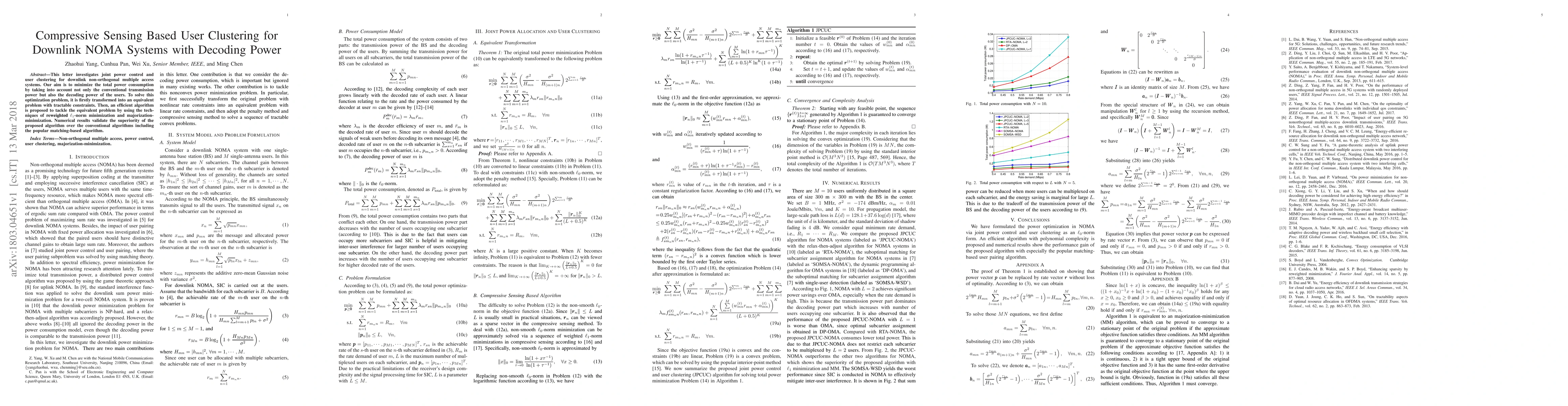 This research proposes a method using compressive sensing to optimize power control and user clustering in non-orthogonal multiple access (NOMA) systems. The technique minimizes both transmission and decoding power, outperforming conventional algorithms in simulations.