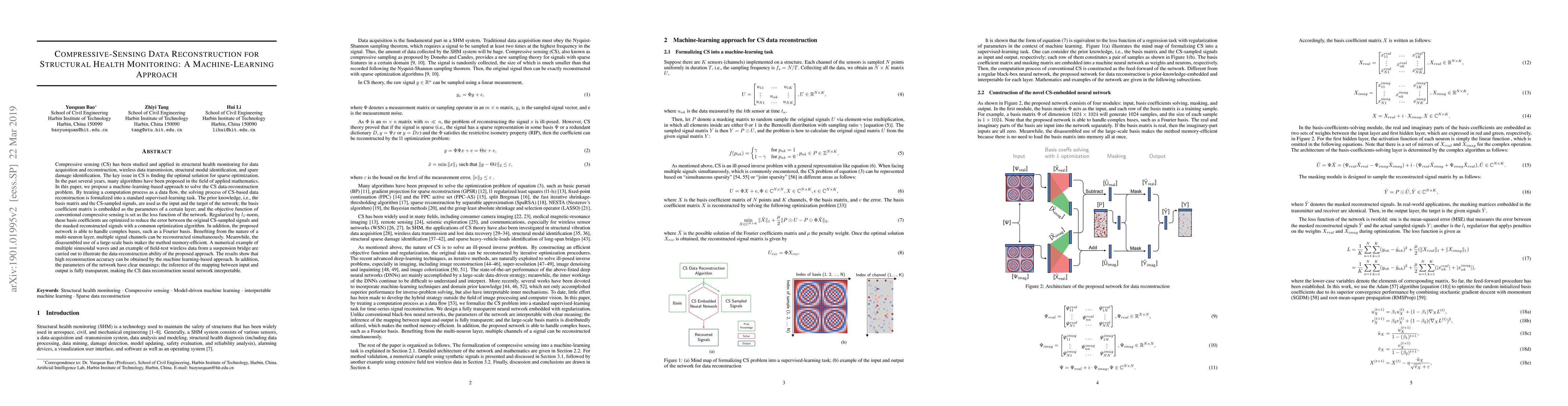 This paper proposes a machine-learning approach for compressive-sensing data reconstruction in structural health monitoring, formalizing the process as a supervised learning task. The method optimizes basis coefficients using an l1-norm loss function, achieving high reconstruction accuracy and interpretability.